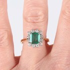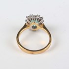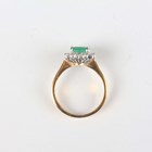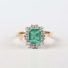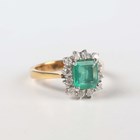 An 18ct gold, emerald and diamond cluster ring, claw set with the cut cornered rectangular step cut emerald within a surround of circular cut diamonds, London 1996, weight 5.1g, ring size approx O1/2.