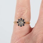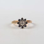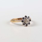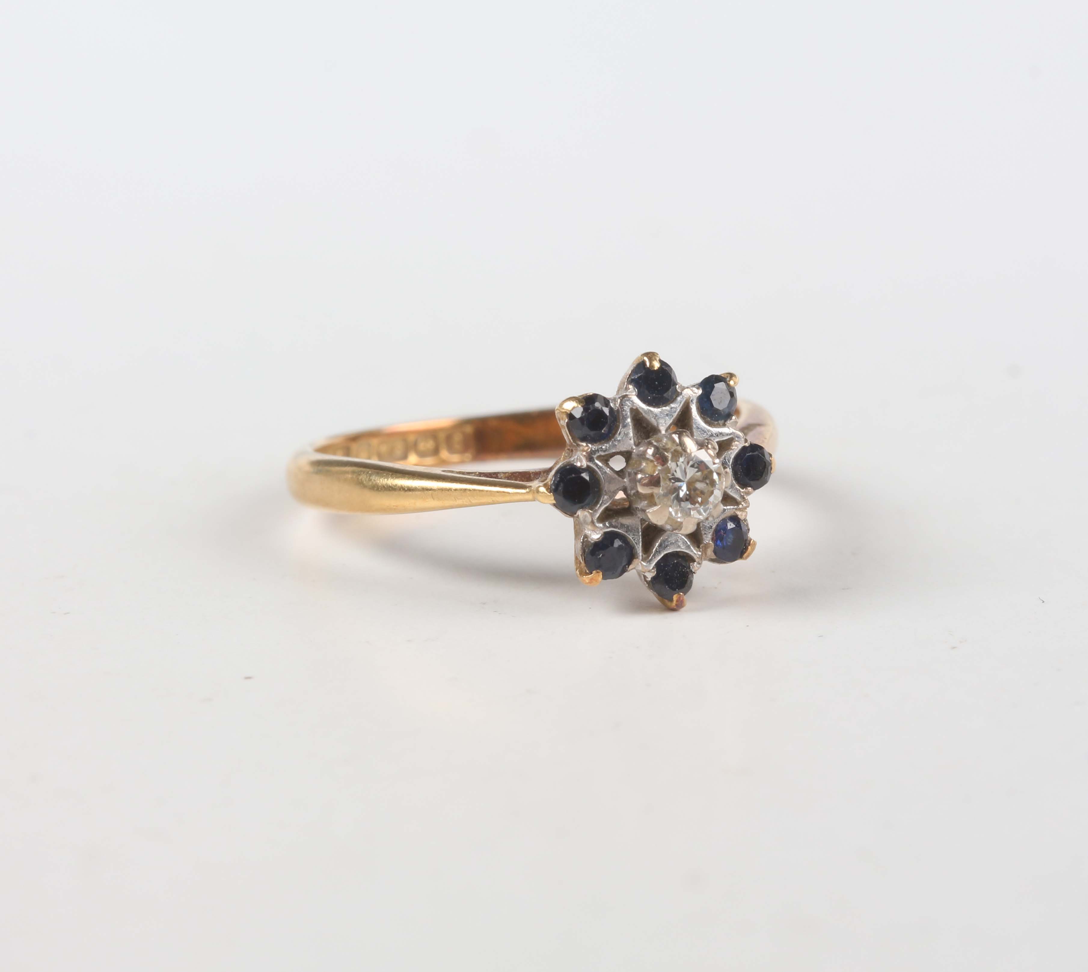 An 18ct gold, sapphire and diamond nine stone cluster ring, claw set with the circular cut diamond within a surround of eight circular cut sapphires, Birmingham 1965, weight 2.4g, ring size approx J.
