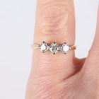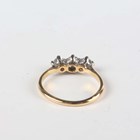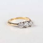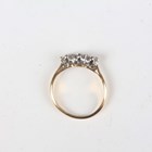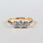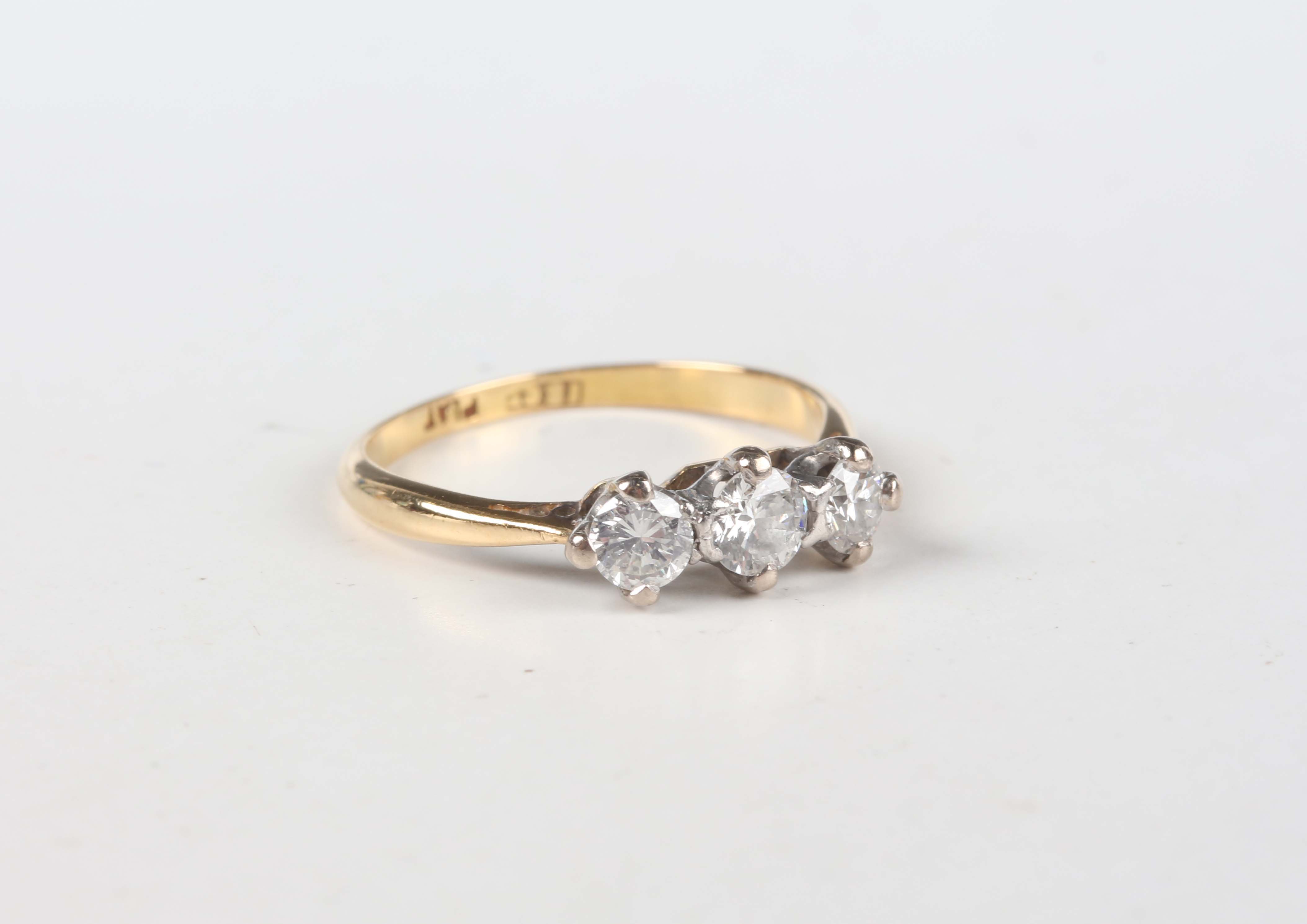 A gold, platinum and diamond three stone ring, claw set with a row of circular cut diamonds, detailed ‘18ct plat’, weight 2g, ring size approx J.