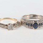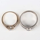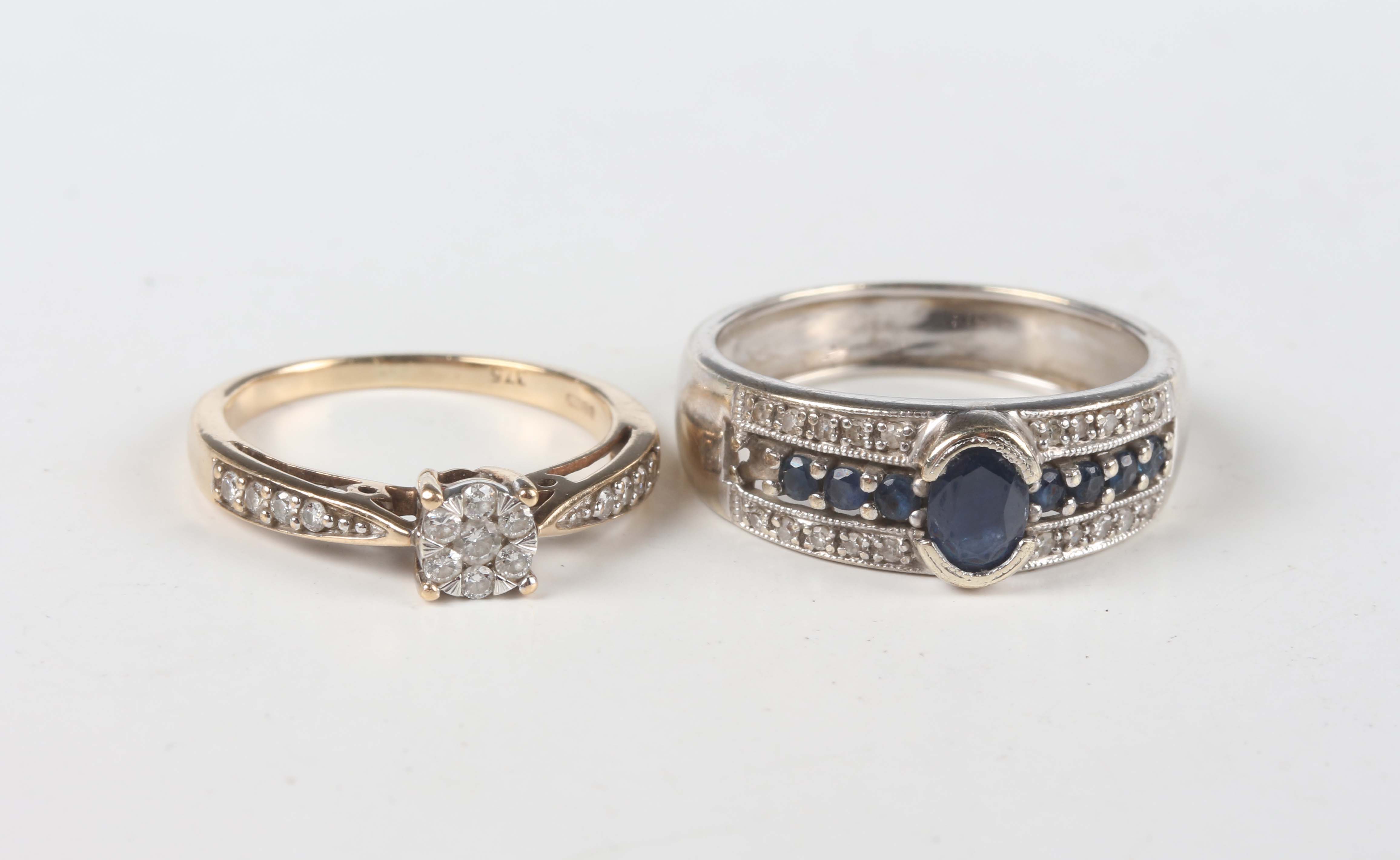 A 9ct white gold, sapphire and diamond ring, mounted with the principal oval cut sapphire at the centre, ring size approx P1/2 (one sapphire lacking), and a 9ct gold and diamond cluster ring with diamond set four stone shoulders, ring size approx K, total weight 5.9g.