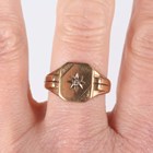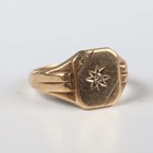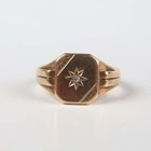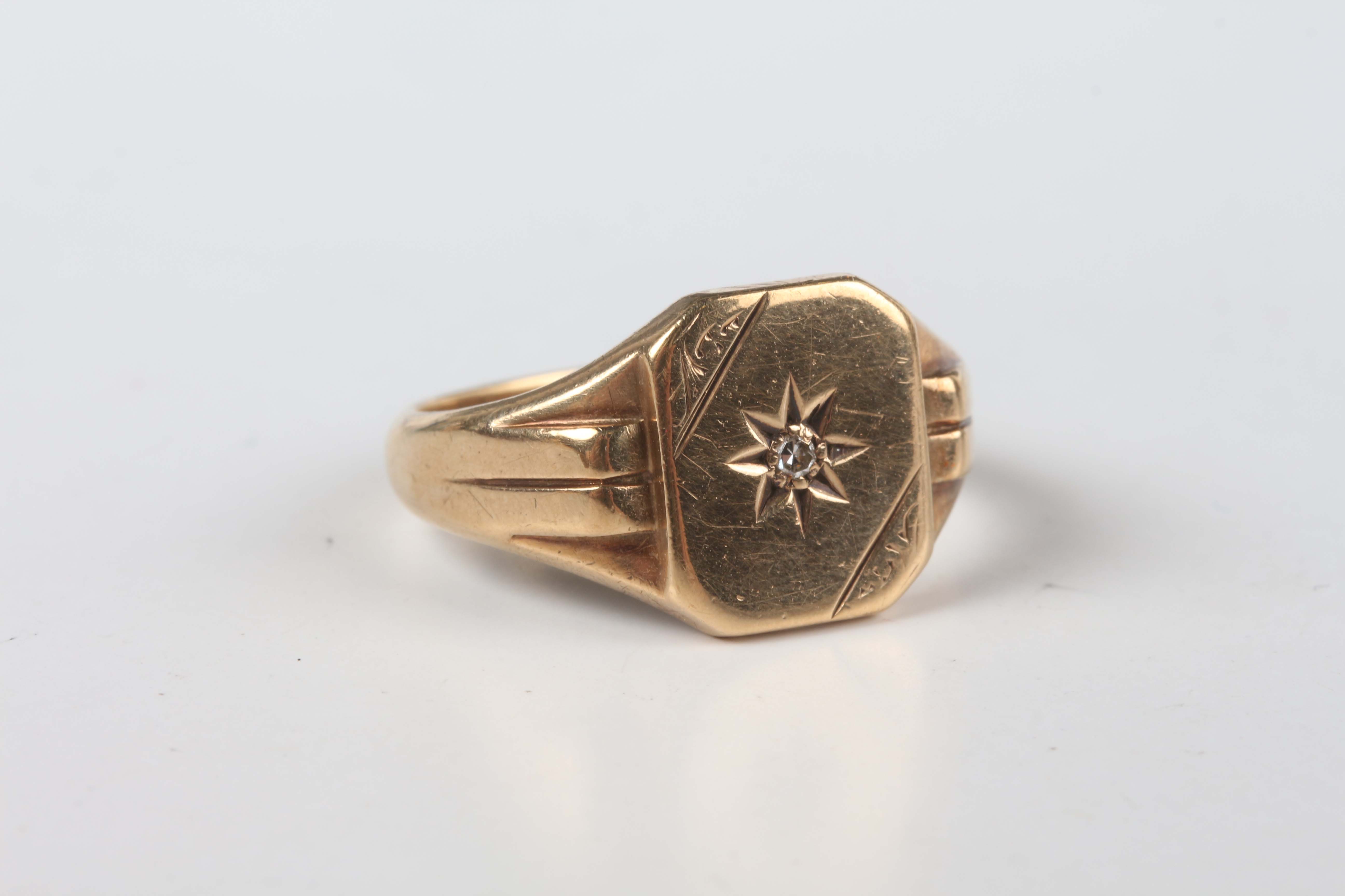 A 9ct gold signet ring, star set with a diamond between ridged shoulders, weight 6.1g, ring size approx Q1/2, with a case.
