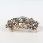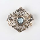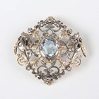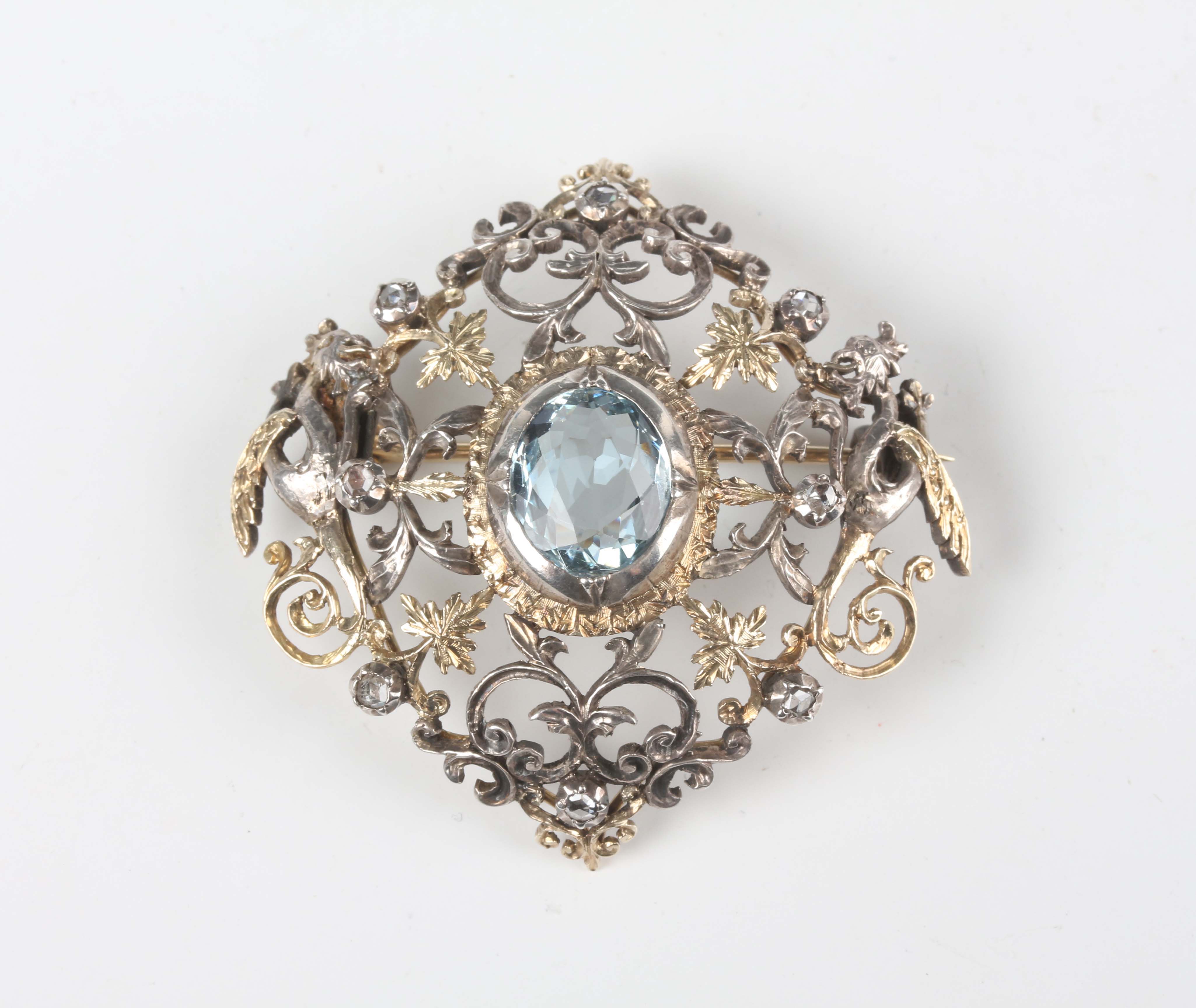 A gold backed, silver and gilt set, aquamarine and rose cut diamond brooch, possibly French, in a pierced foliate scroll and mythological bird design, collet set with the oval cut aquamarine within a surround of eight rose cut diamonds, unmarked, weight 14g, width 4.8cm, with a case.