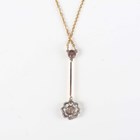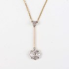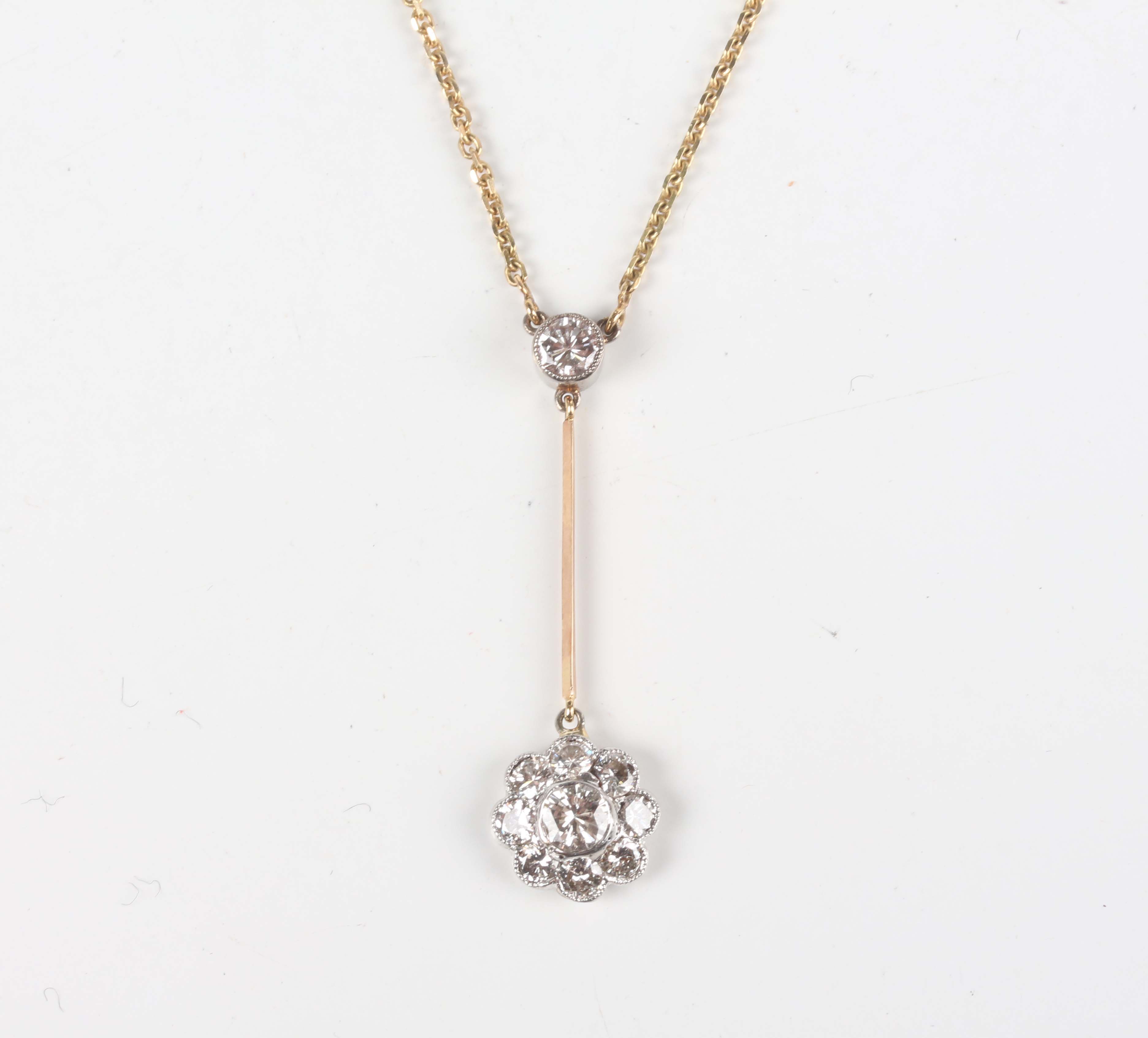 A gold, platinum and diamond pendant necklace, the front with a diamond set flowerhead cluster drop, collet set with the principal circular cut diamond within a surround of eight smaller circular cut diamonds, with a bar and single stone diamond set surmount, on an oval link neckchain with a boltring clasp, weight 4.7g, total length of drop 3.5cm, chain length 45.5cm, cased.