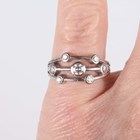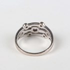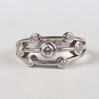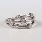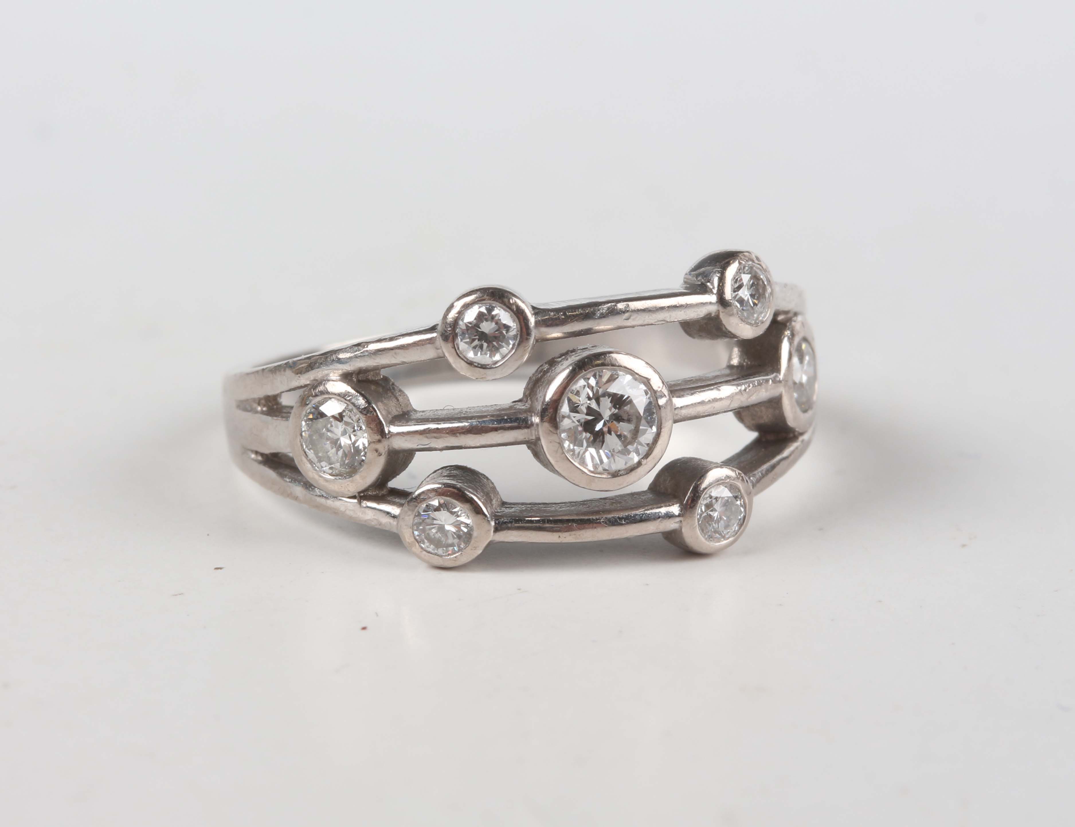 An 18ct white gold and diamond ring in an openwork three row abstract design, collet set with seven circular cut diamonds with the principal diamond at the centre, weight 4g, ring size approx M1/2, with a case.