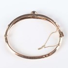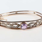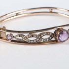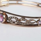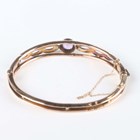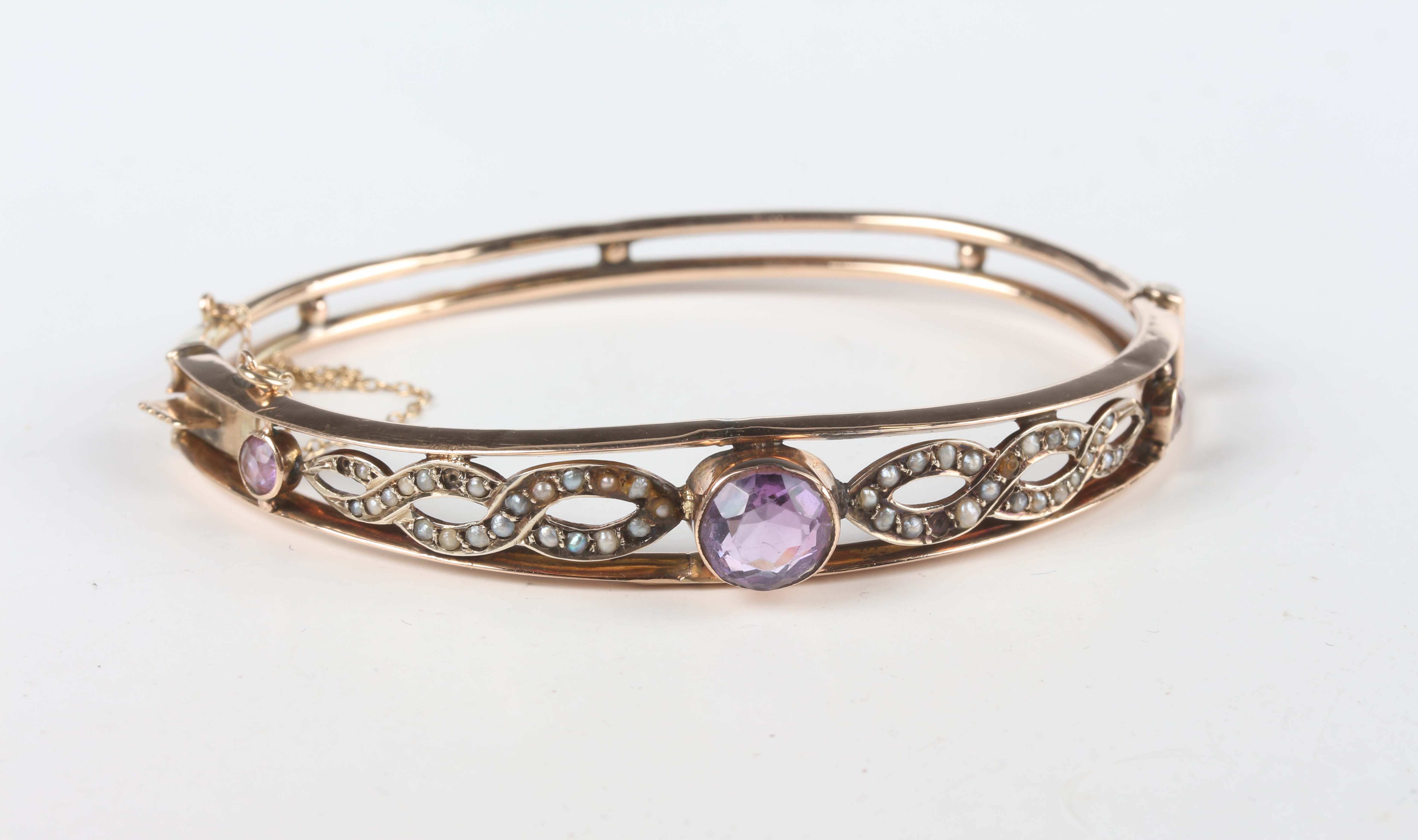 A gold, amethyst and seed pearl oval hinged bangle, the front collet set with three circular cut amethysts, otherwise set with seed pearls in a serpentine design, on a snap clasp, circa 1900, unmarked, weight 9.5g, inside width 6.1cm (some seed pearls lacking).