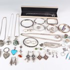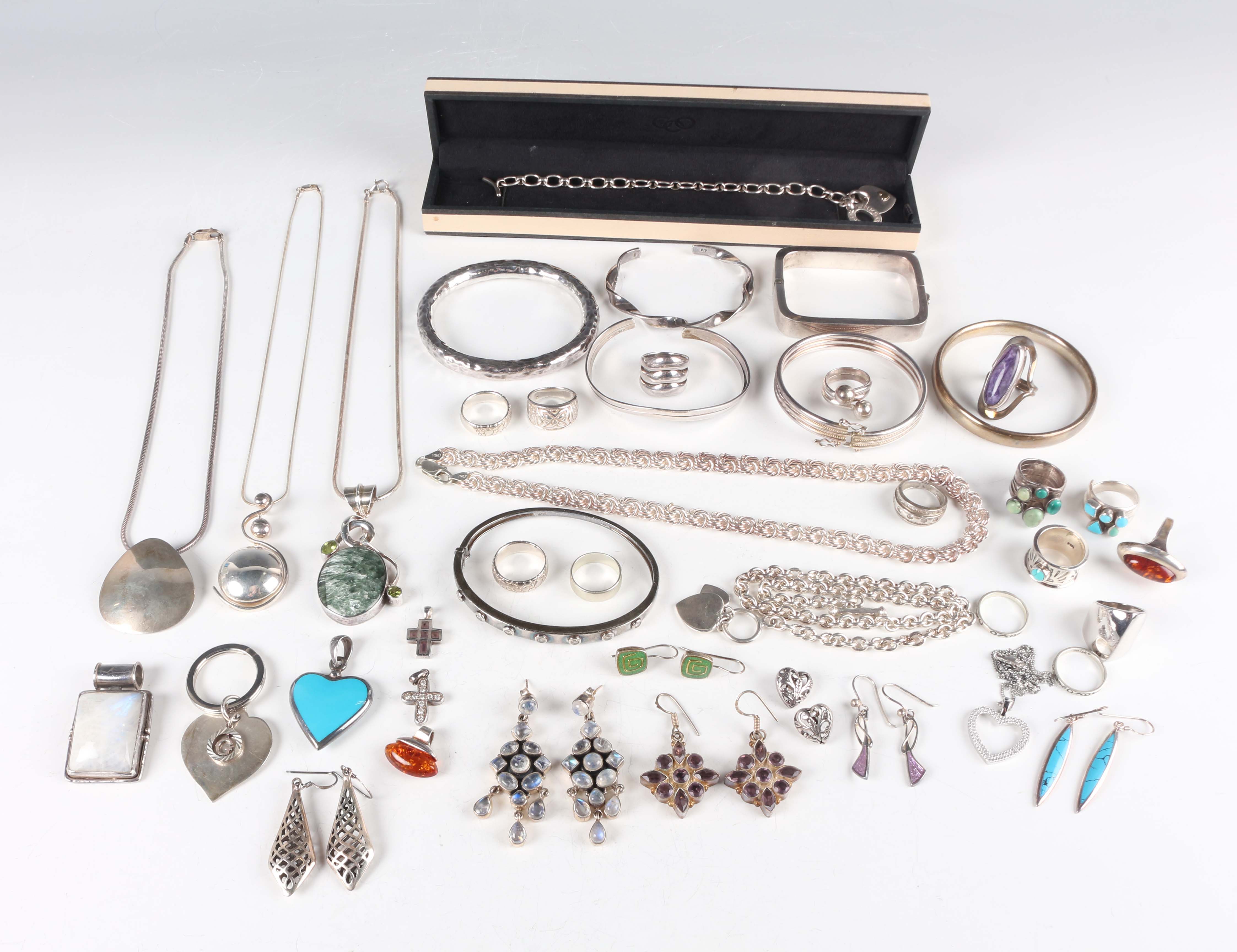 A Links of London silver bracelet, fitted with a heart shaped charm, on a 'T' bar and oval clasp, detailed 'Links London', length 19.5cm, cased, and a group of other silver jewellery, including bangles, pendants and chains, earrings and rings.