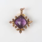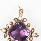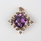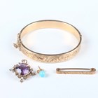 A gold, amethyst and imitation seed pearl pendant, collet set with a cushion shaped amethyst within a beaded and imitation seed pearl surround, detailed '9ct', length 2.8cm (one imitation pearl lacking), a 9ct gold bar brooch with engraved decoration, Birmingham 1923, width 3.8cm, total weight 5g, a turquoise set earstud with a gold butterfly, detailed '585', and a gilt metal oval hinged bangle, the front with engraved decoration, detailed '9ct gold Metal Core', inside width 5.8cm.