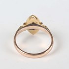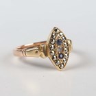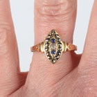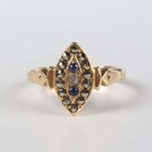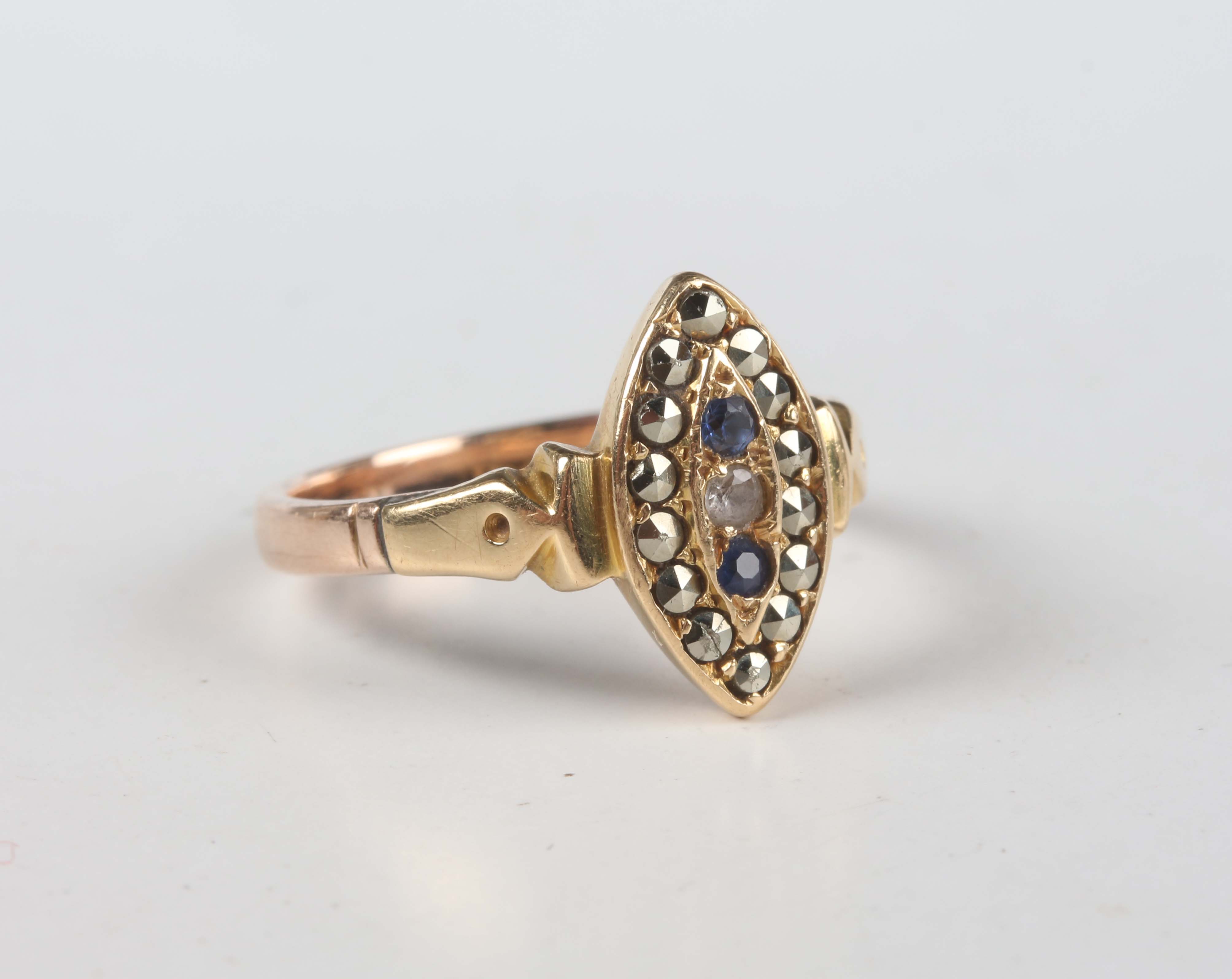 A gold, marcasite and blue and colourless gem set marquise shaped cluster ring, unmarked, weight 4.2g, ring size approx O.
