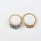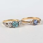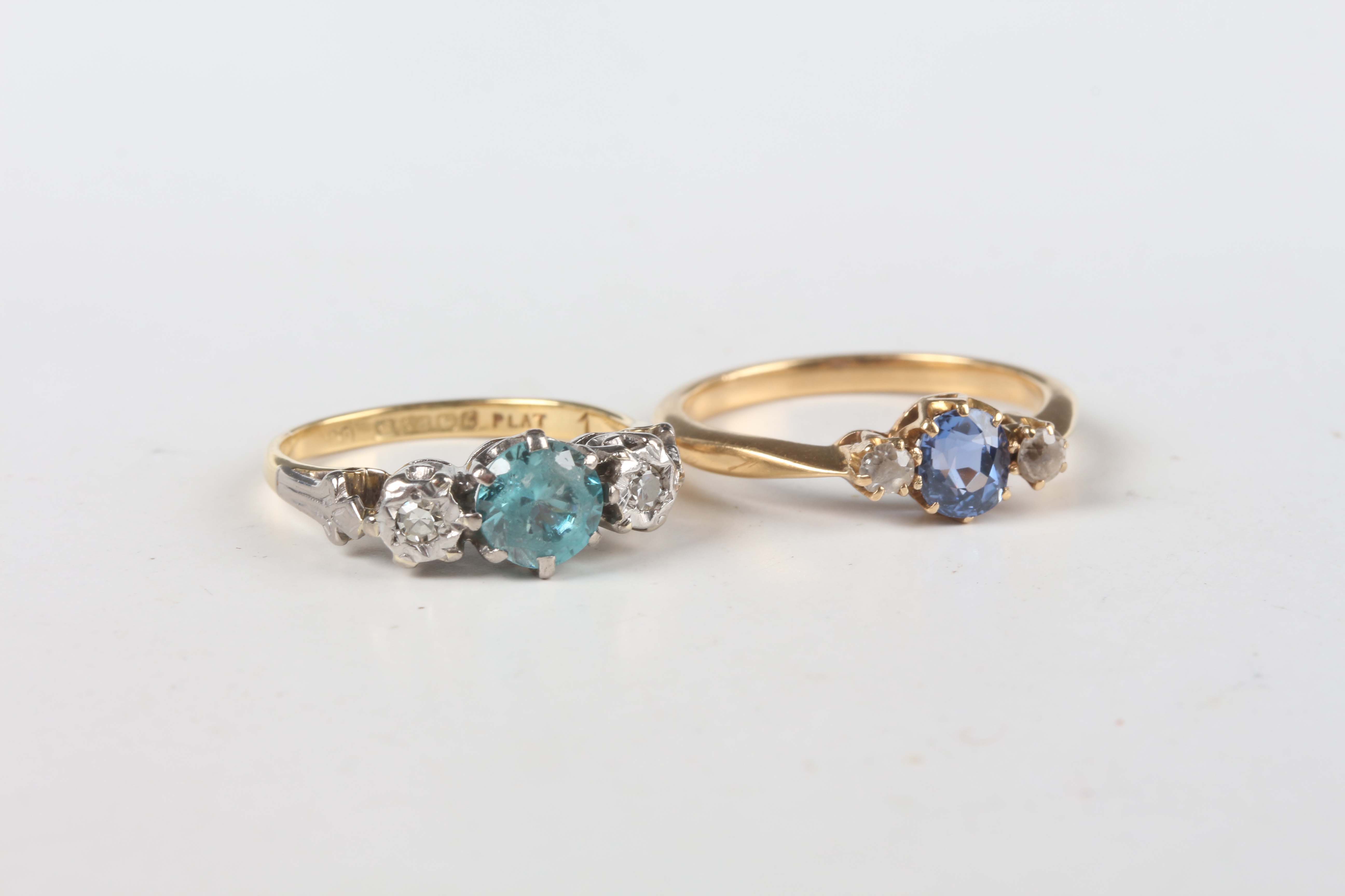 An 18ct gold, platinum, blue zircon and diamond three stone ring, claw set with the circular cut blue zircon between two circular cut diamonds, Birmingham 1960, weight 3.3g, ring size approx K, and a gold, sapphire and colourless gem set three stone ring, unmarked, weight 2.8g, ring size approx N.