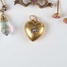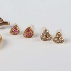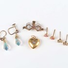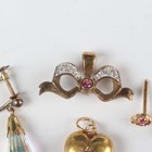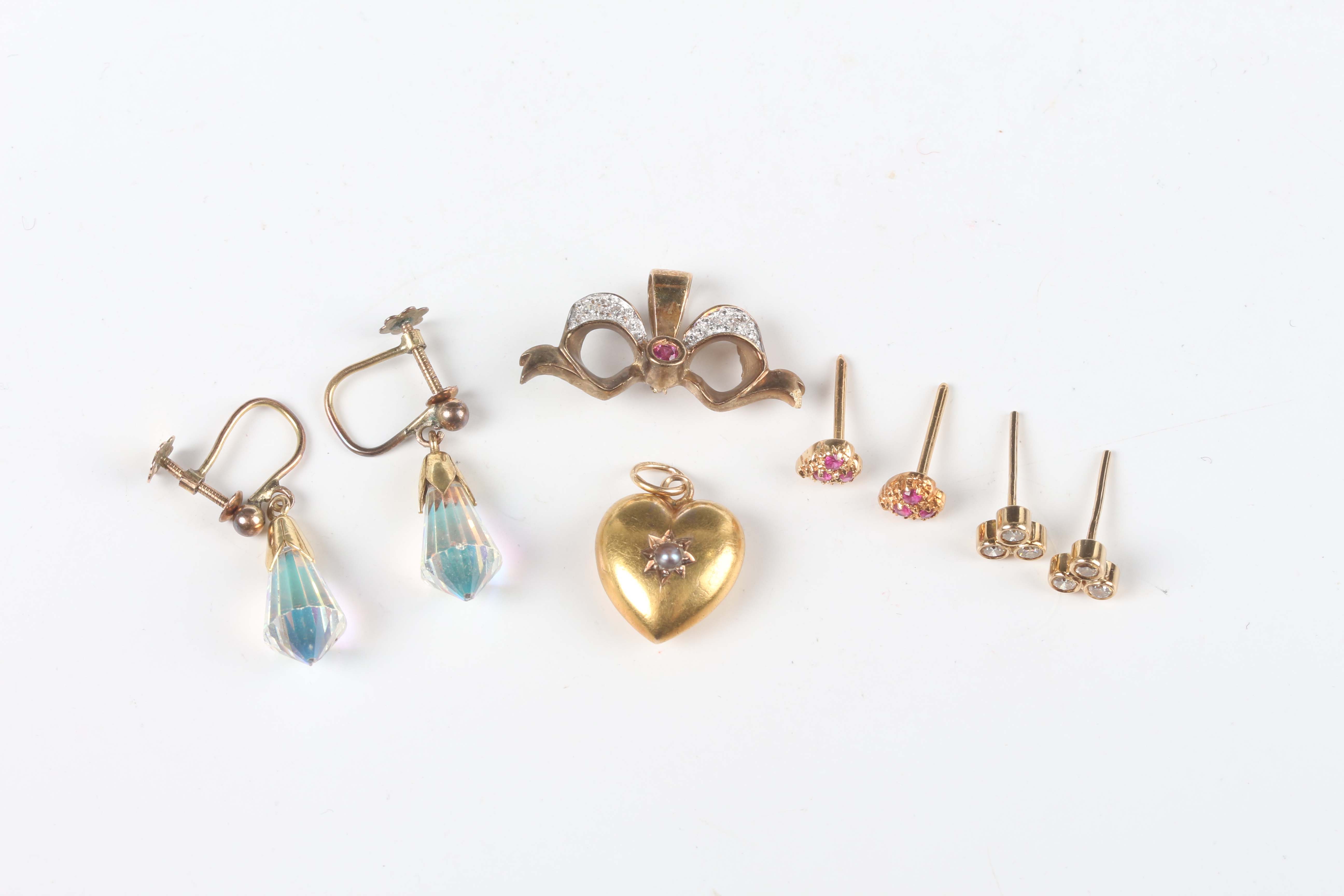 A late Victorian 15ct gold and half-pearl set heart shaped pendant, Birmingham 1894, weight 1.2g, length 1.7cm, a 9ct gold, diamond and red gem set top of a pendant, designed as a bow, a pair of gold and diamond three stone earstuds with post fittings, a pair of gold and red gem set three stone earstuds with post fittings, and a pair of earrings with gold screw fittings, detailed ‘9ct’, total weight 5.1g.