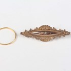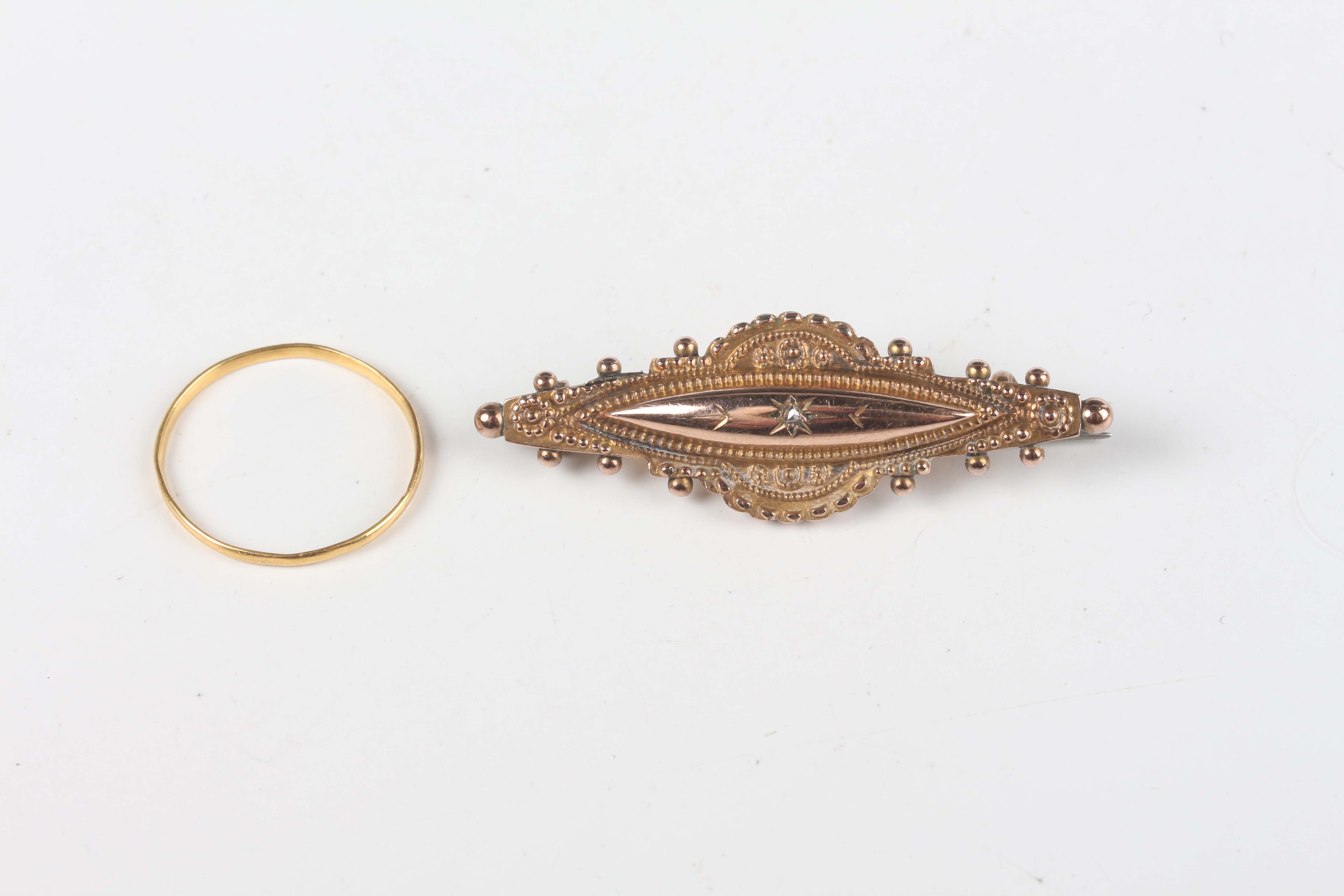 A 22ct gold wedding ring, weight 0.6g, ring size approx M, and a late Victorian 9ct gold and rose cut diamond bar brooch, Birmingham 1899, weight 2.2g, width 4.3cm.