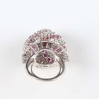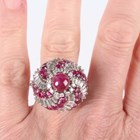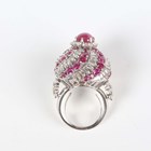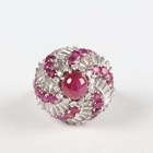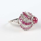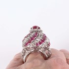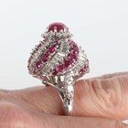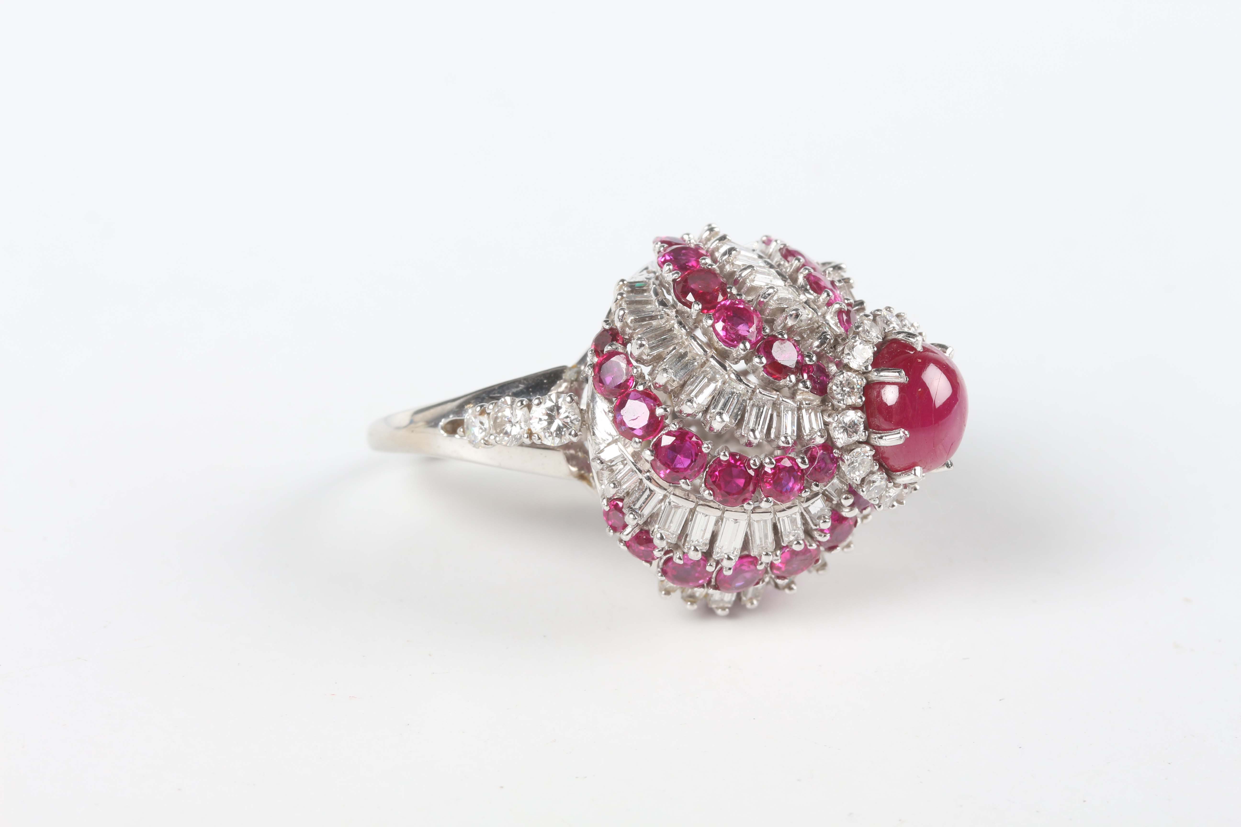 A white gold, ruby and diamond ring of bombé form in a spiralling design, claw set with the principal circular cabochon ruby within a surround of circular cut diamonds and an outer border of alternating baguette cut diamonds and circular cut rubies, unmarked, weight 25.4g, ring size approx N1/2.