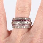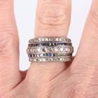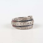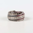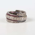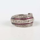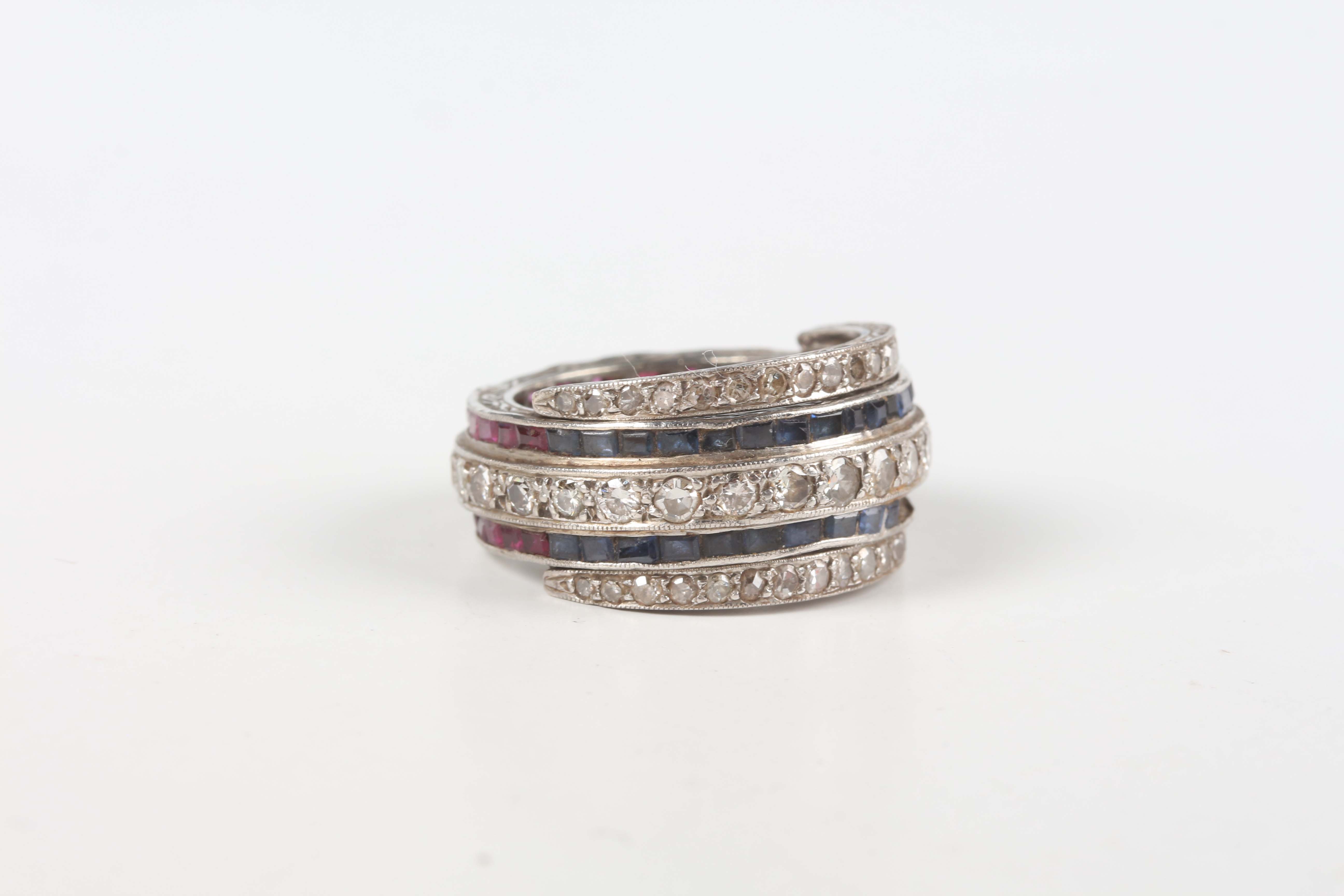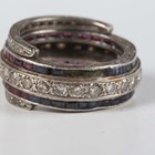 A platinum, diamond, ruby and sapphire eternity ring, mounted with a row of circular cut diamonds between rows of baguette cut rubies and sapphires, with twin diamond set outer swing sides, unmarked, weight 11g, ring size approx O (some sapphires lacking).