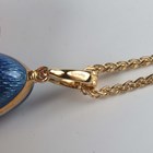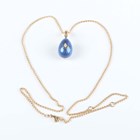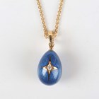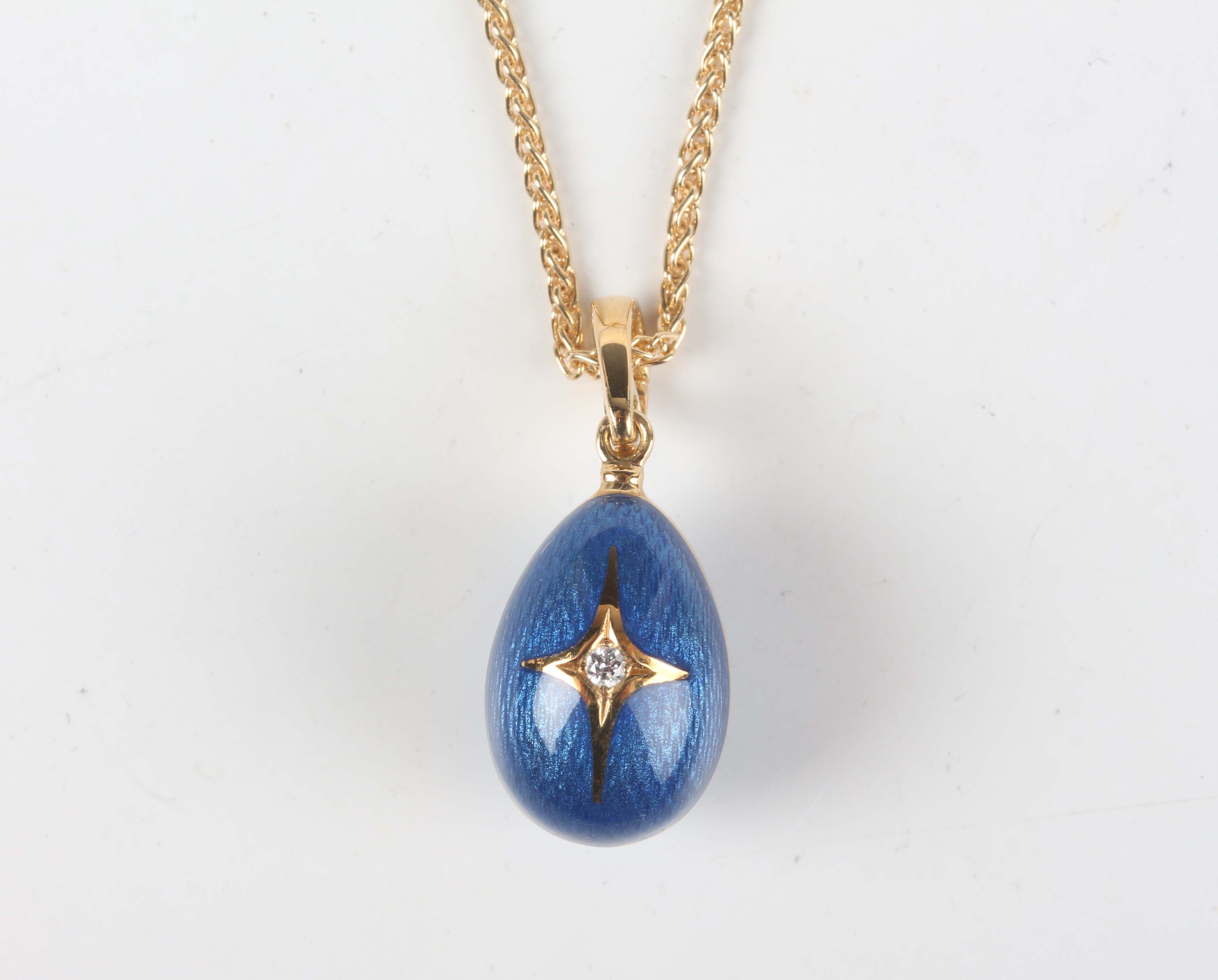 A Victor Mayer for Fabergé 18ct gold, diamond and enamelled egg shaped pendant, limited edition 7 of 1000, the front star set with a circular cut diamond against a blue guilloché enamelled ground, detailed 'Fabergé 7/1000' and '750', weight 7.6g, length including suspension loop 2.9cm, with a certificate booklet, and a gold multiple link neckchain on a sprung hook shaped clasp, detailed '750', weight 6.6g, length 50.5cm.