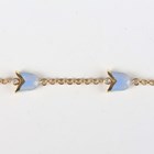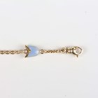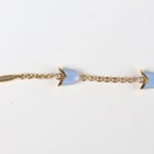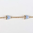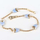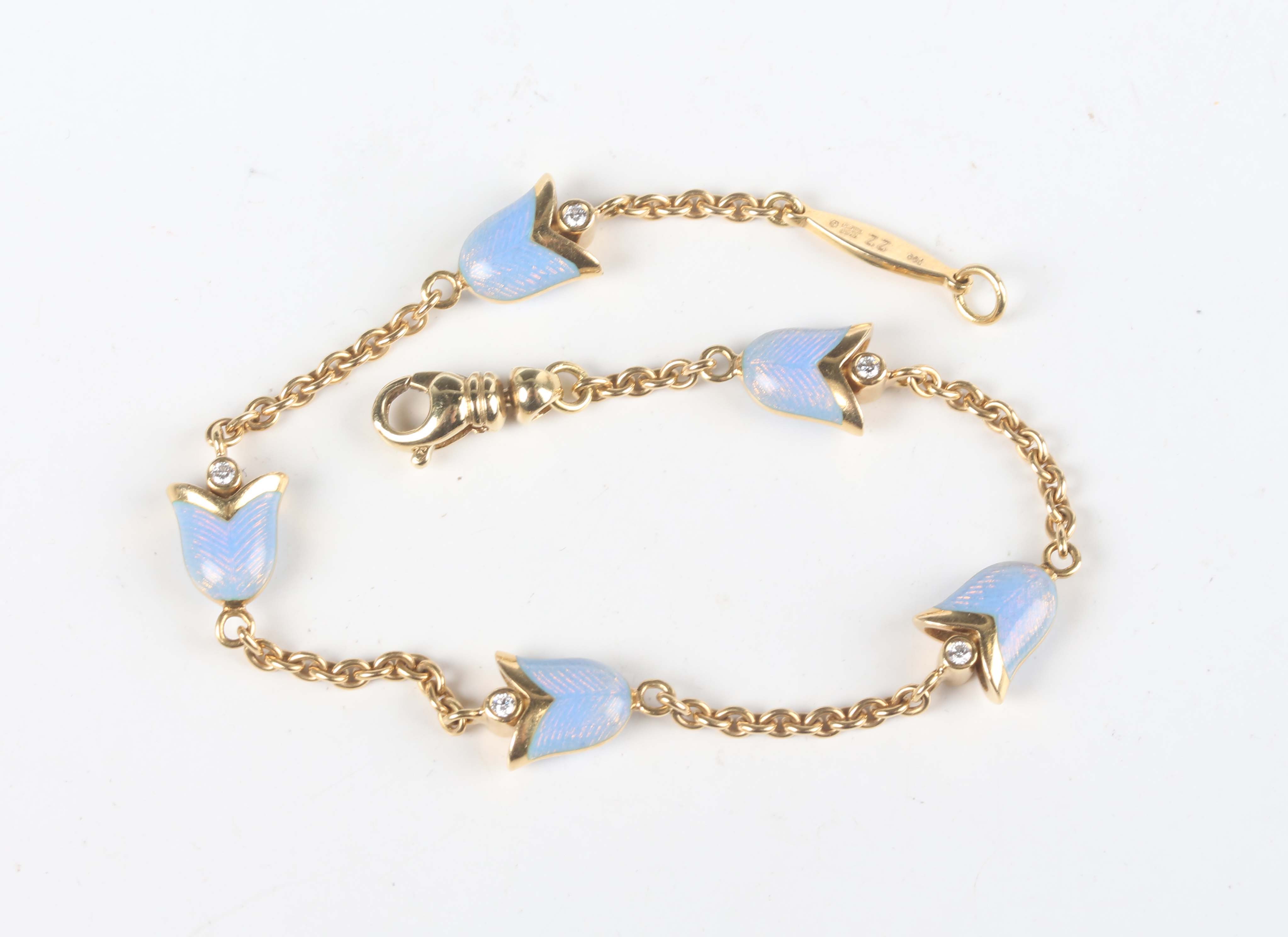 A Victor Mayer for Fabergé 18ct gold, diamond and enamelled bracelet, designed as a row of five pale blue enamelled bellflower links, each collet set with a circular cut diamond to each side, on a sprung hook shaped clasp, detailed 'Fabergé 22' and '750'. weight 13.8g, length 19cm, with a certificate booklet.