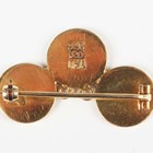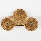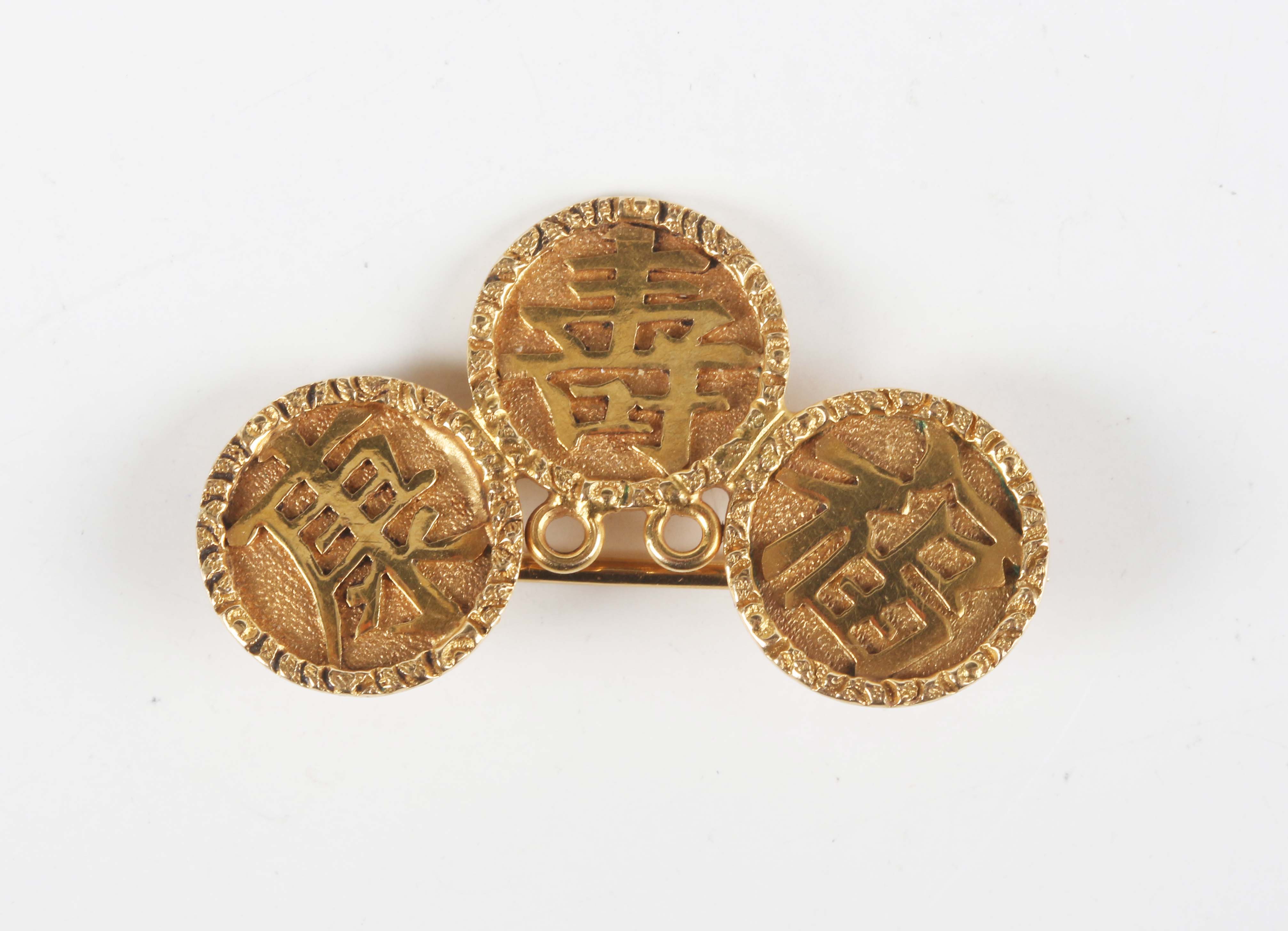 A Chinese gold brooch, designed as three characters, each within a circular textured surround, detailed 'YL20', weight 4.8g, width 3.4cm.