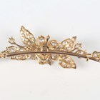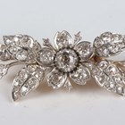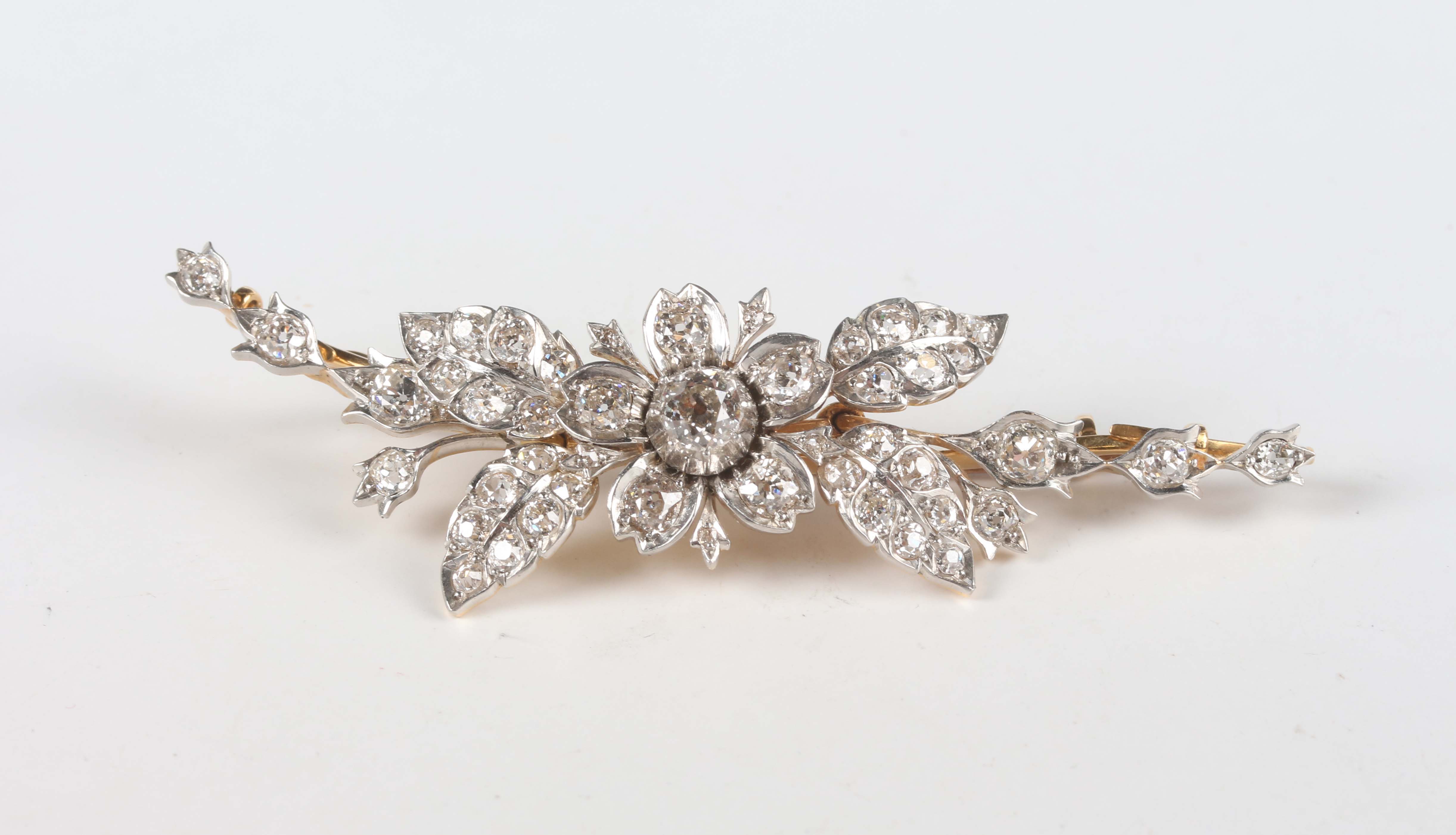 A Victorian gold and silver set diamond pendant brooch, claw set with the principal old cut cushion shaped diamond within a petal surround between leaf and flowerbud motifs, mounted with smaller old cut cushion shaped diamonds, with a detachable brooch fitting, unmarked, weight 15.6g, length 7cm.