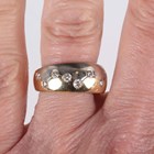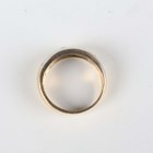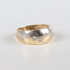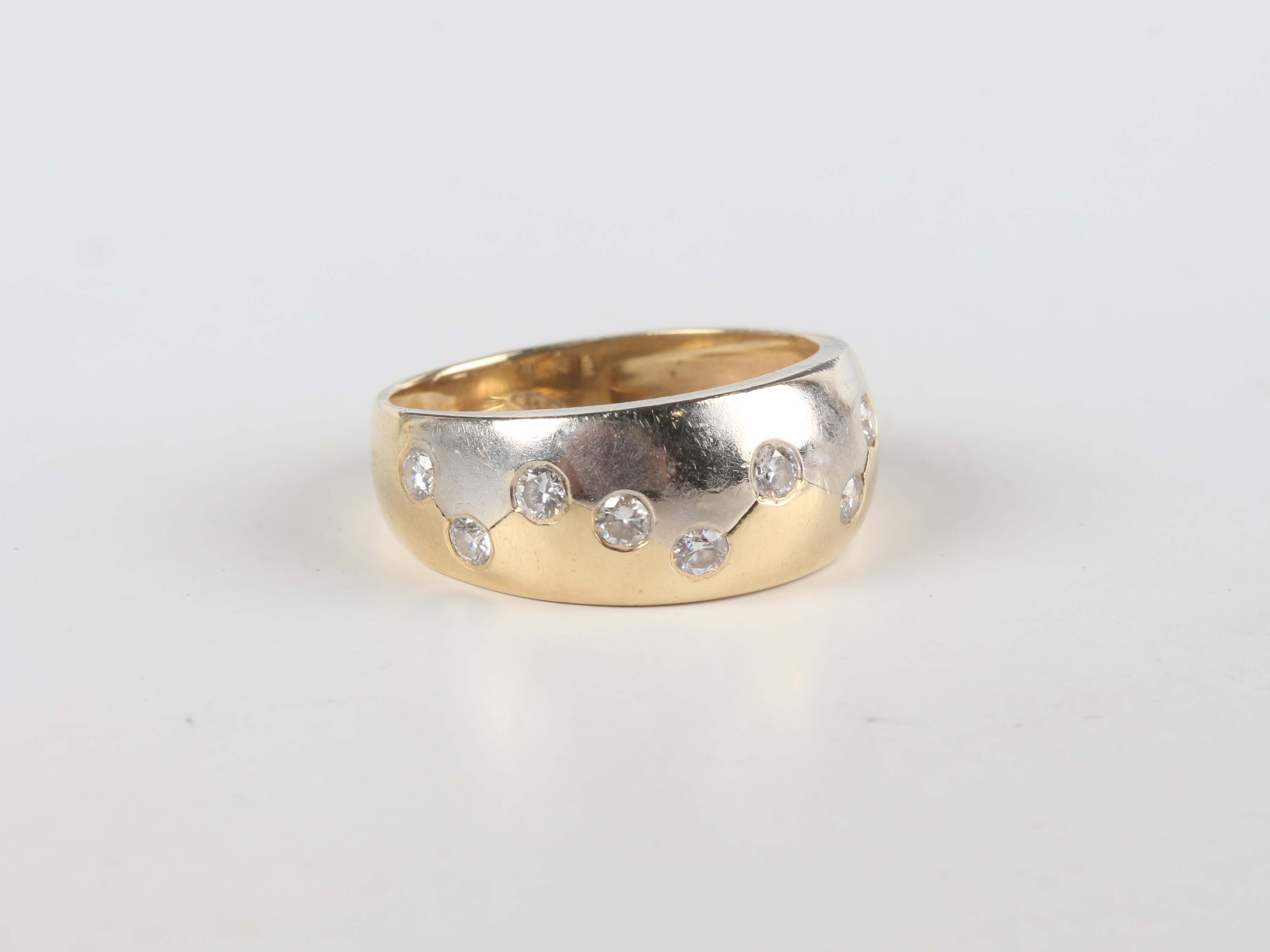A two colour gold and diamond ring, mounted with eight circular cut diamonds in an abstract design, detailed '585', weight 5.3g, ring size approx N1/2.