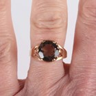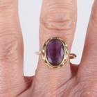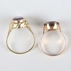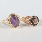 A gold ring, collet set with an oval cut amethyst, detailed ‘585’, ring size approx P, and another gold ring, claw set with a circular cut smoky quartz, detailed ‘585 Finland’, ring size approx N, total weight 7g.