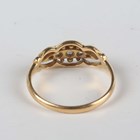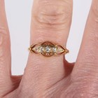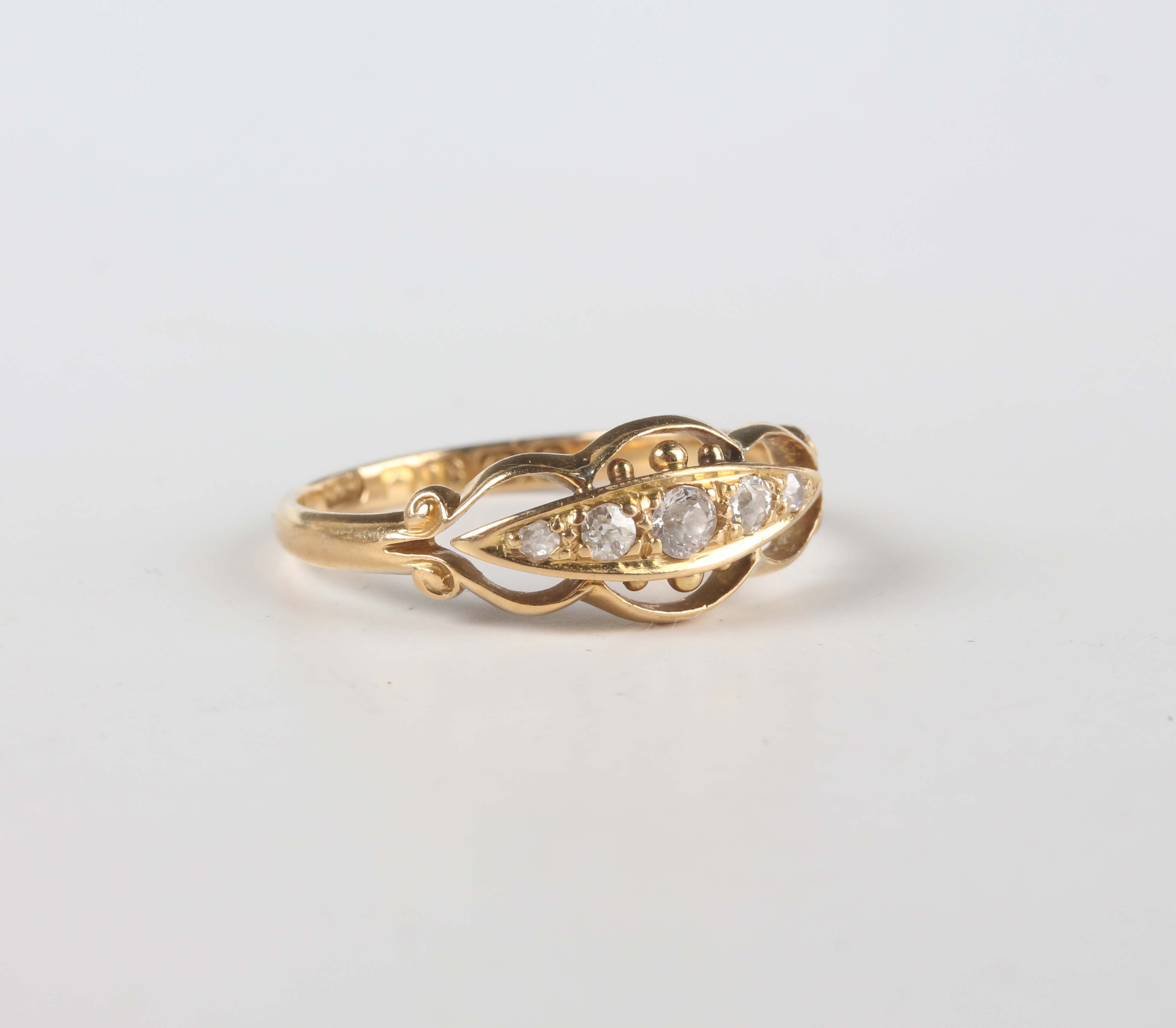 An 18ct gold and diamond five stone ring, mounted with a row of graduated cushion shaped diamonds between beaded openwork sides, Birmingham 1905, weight 2.1g, ring size approx L.