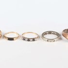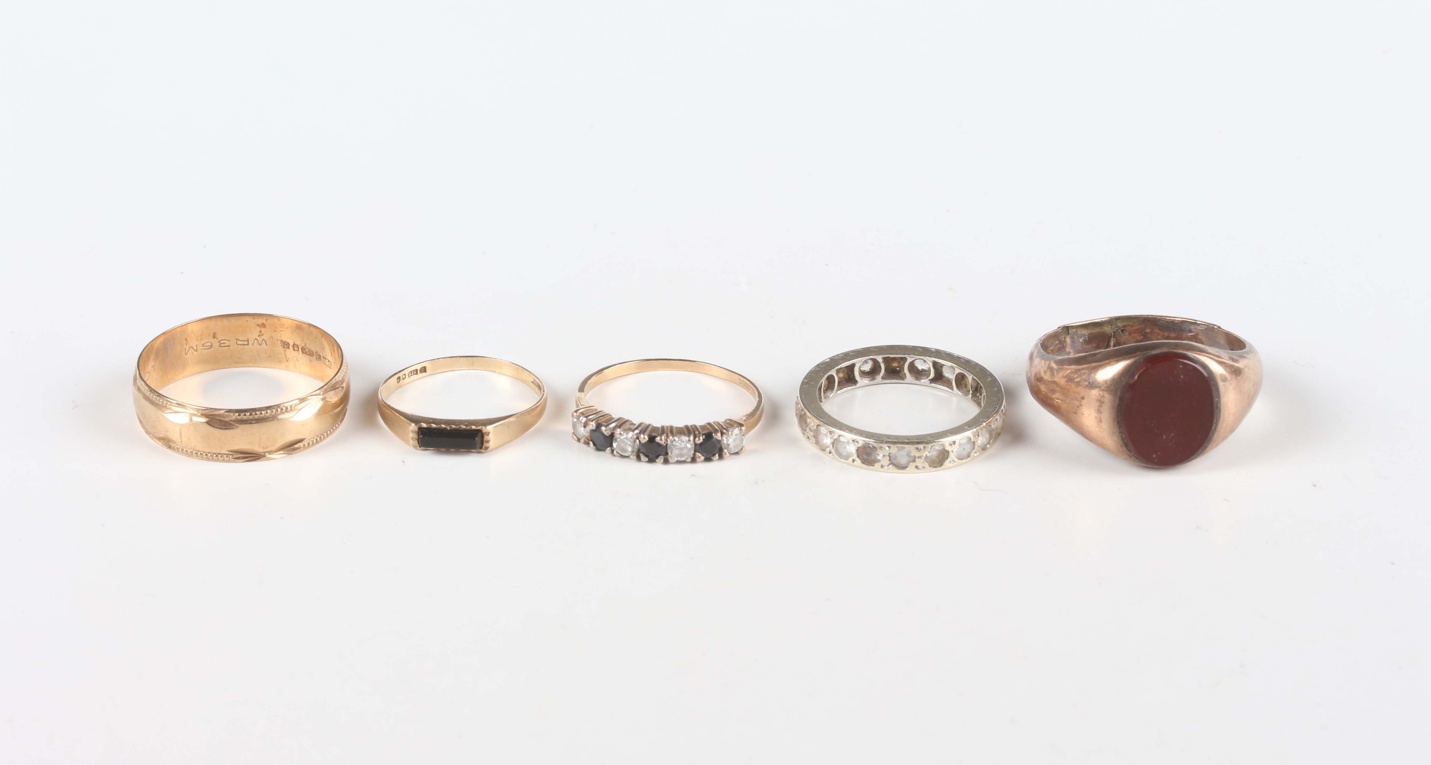 A 9ct gold wedding ring, a 9ct gold, sapphire and colourless gem set seven stone half hoop ring, a 9ct gold and black onyx ring, total weight 4.4g, a colourless gem set eternity ring, unmarked, and a late Victorian 9ct gold and cornelian signet ring (hollow and likely loaded).