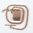A 9ct gold vesta case with engraved presentation inscription, Birmingham 1900 by Joseph Gloster, weight 20.5g, length 4.2cm, and a 9ct gold graduated curblink Albert watch chain, fitted with a T-bar and swivel to one end and a gilt metal swivel to the other, total weight 43.7g.