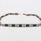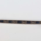 A gold, platinum, sapphire and diamond bracelet, the front mounted with a row of five graduated rectangular cut sapphires alternating with old cut cushion shaped diamonds, between engraved sides and shaped oval links, on a snap clasp, unmarked, weight 7.7g, length 17cm.