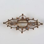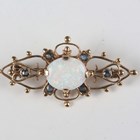 A 9ct gold, opal and sapphire brooch, claw set with an oval opal in an openwork scrolling and beaded design, mounted with six sapphires, detailed '375', weight 3.7g, width 4cm.