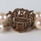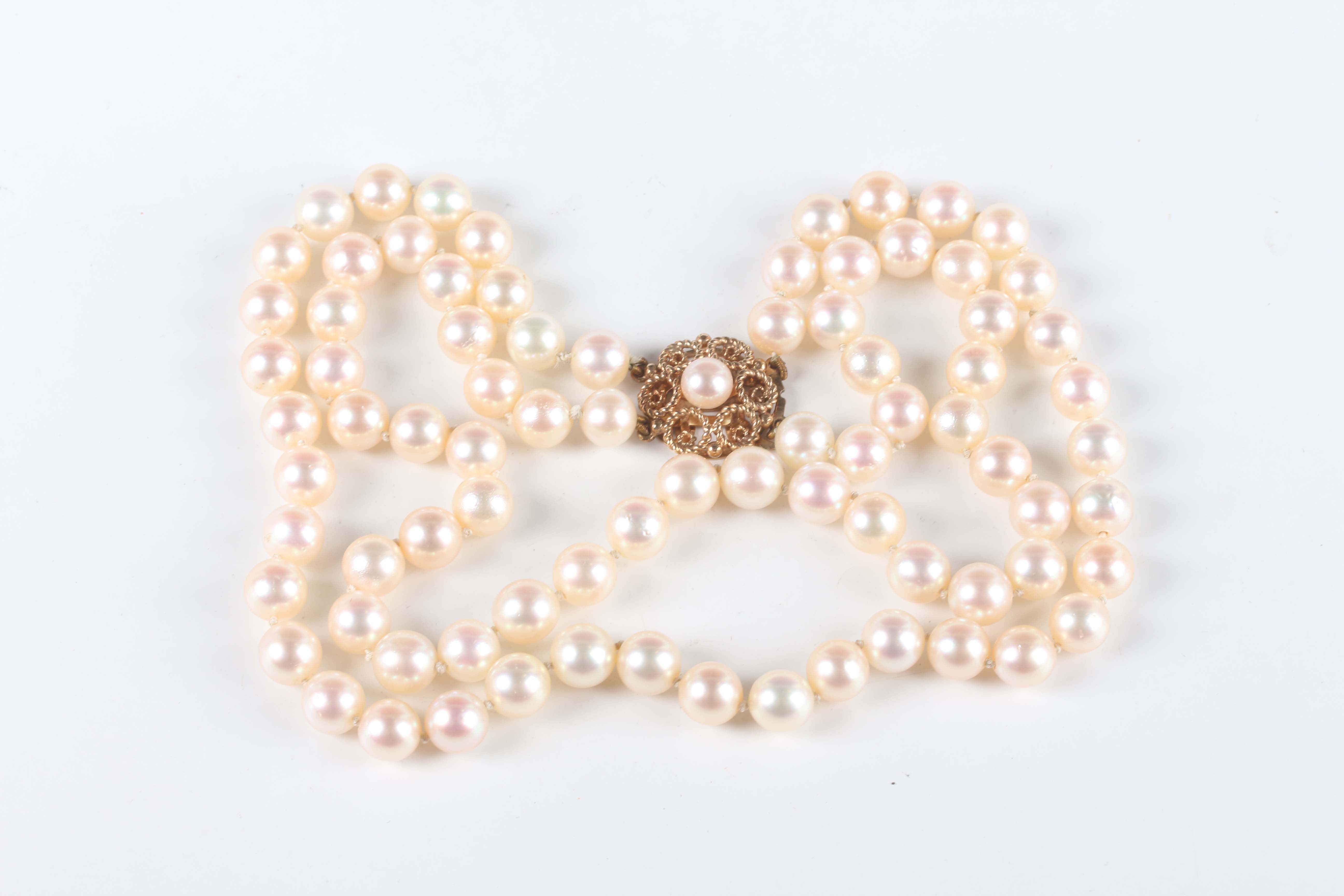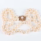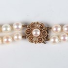 A two row necklace of uniform cultured pearls on a 9ct gold and cultured pearl snap clasp, length of shortest strand 34.5cm, diameter of clasp 1.7cm.