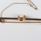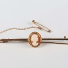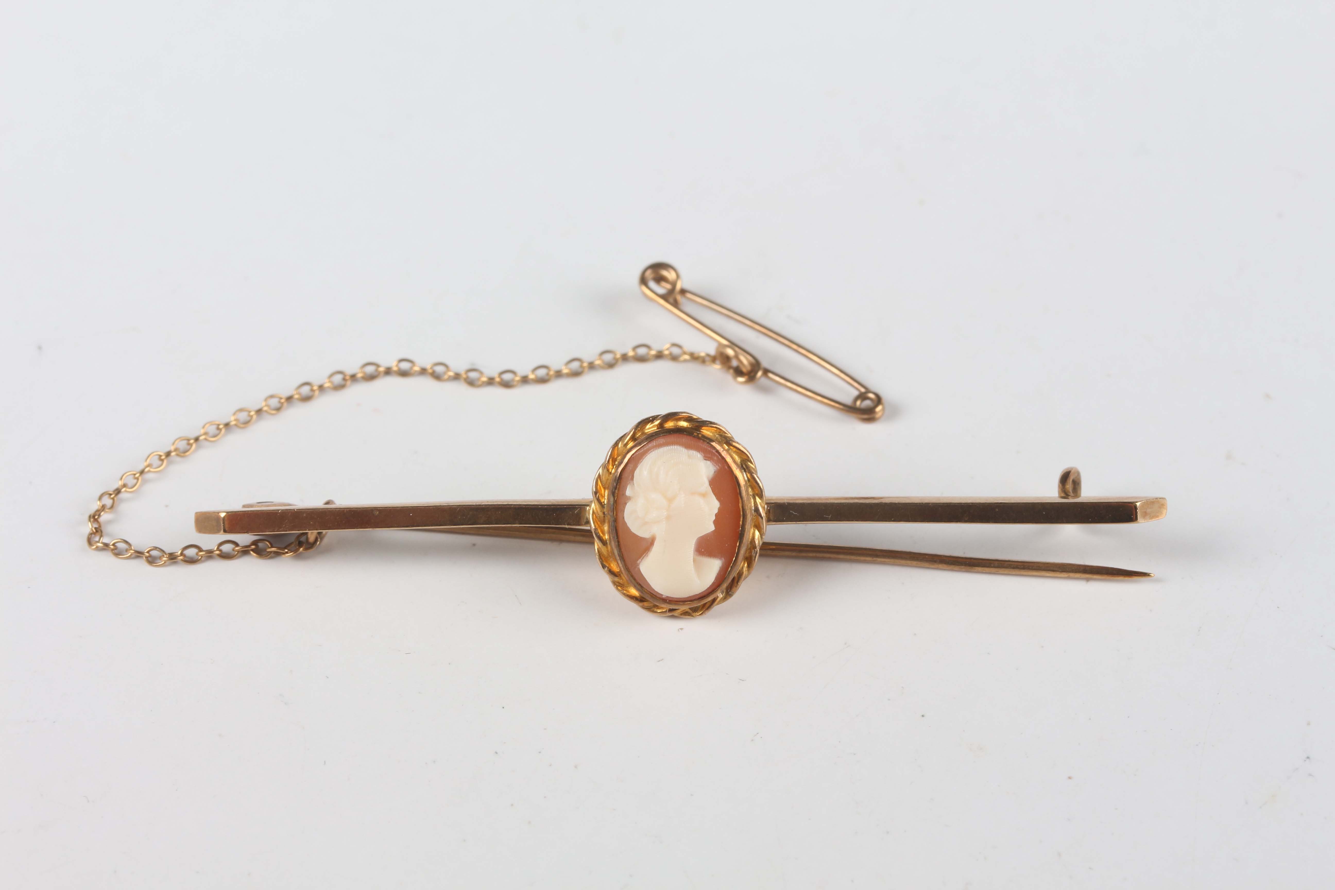 A gold and oval shell cameo bar brooch, carved as a portrait of a lady, weight 3.8g, width 5.7cm.