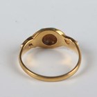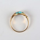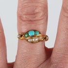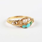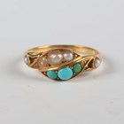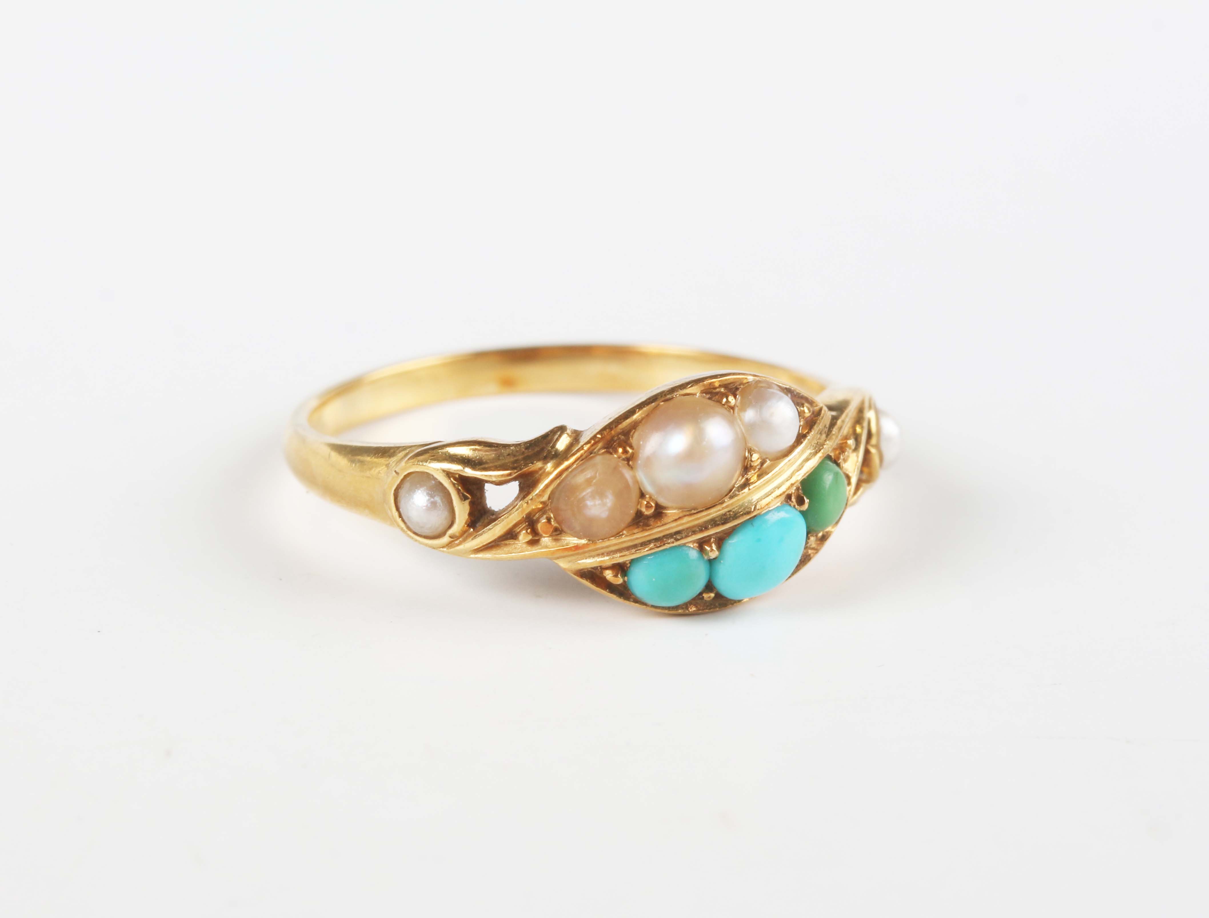 A gold, turquoise and half-pearl ring, mounted with a row of three turquoises and a row of three half-pearls between half-pearl set shoulders, weight 3g, ring size approx M.
