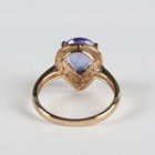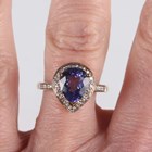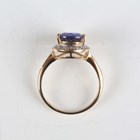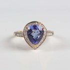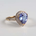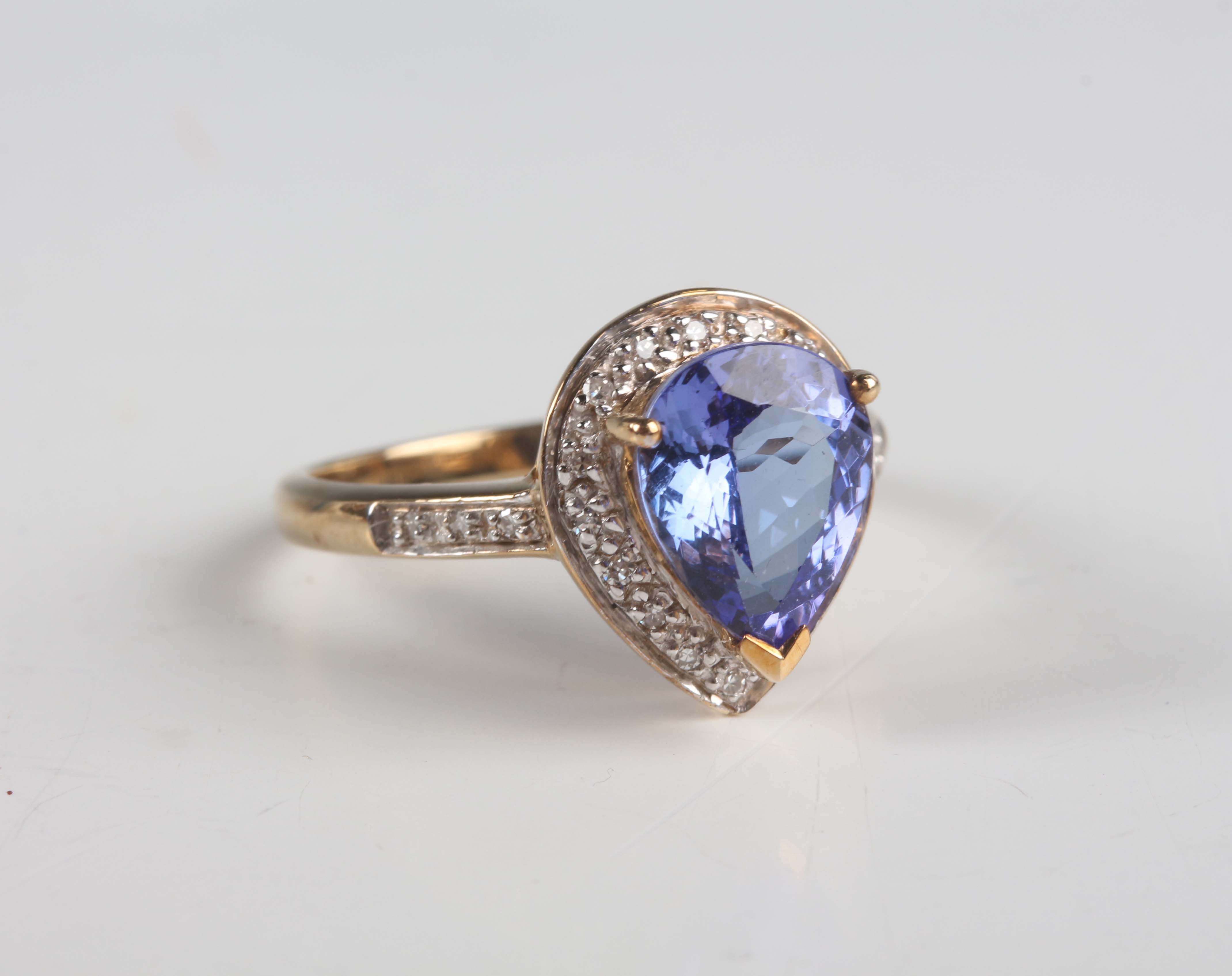 A 9ct gold, tanzanite and diamond ring, claw set with a pear shaped tanzanite within a surround of circular cut diamonds, between diamond three stone shoulders, detailed ‘375’, weight 3g, ring size approx O1/2, with a case.