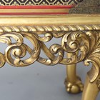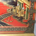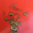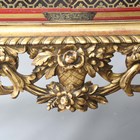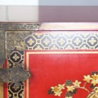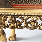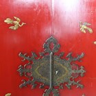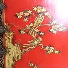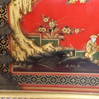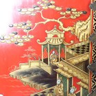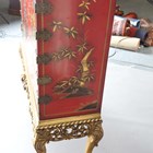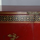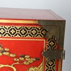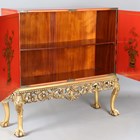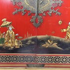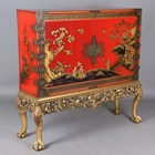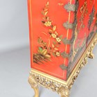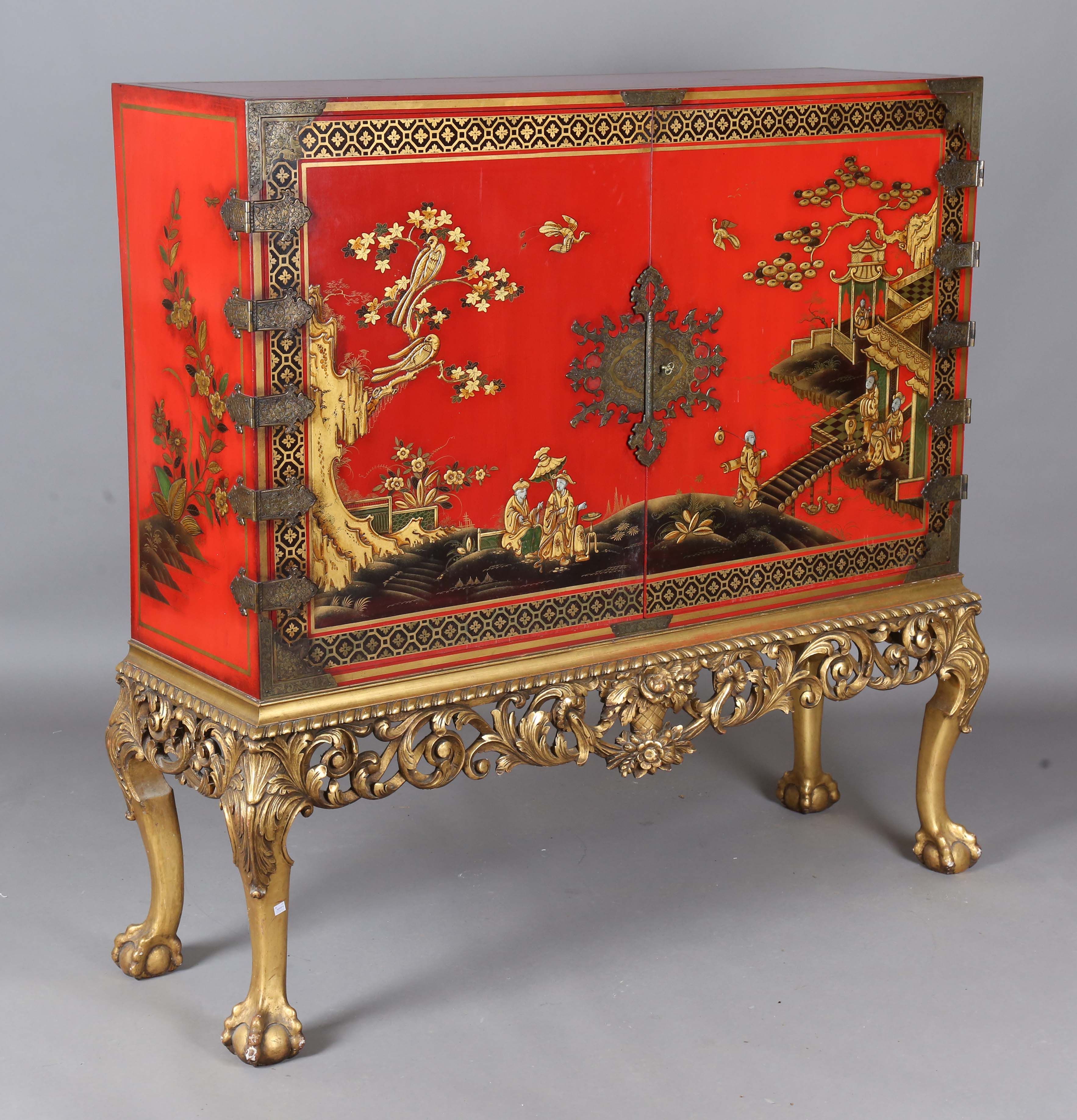 An early/mid-20th century red lacquered chinoiserie and giltwood side cabinet, the two doors decorated in raised gilt with figures in a landscape, raised on a carved giltwood stand terminating in claw and ball feet, height 137cm, width 147cm, depth 48cm.