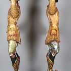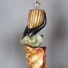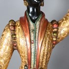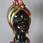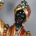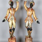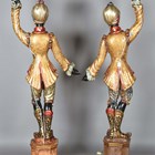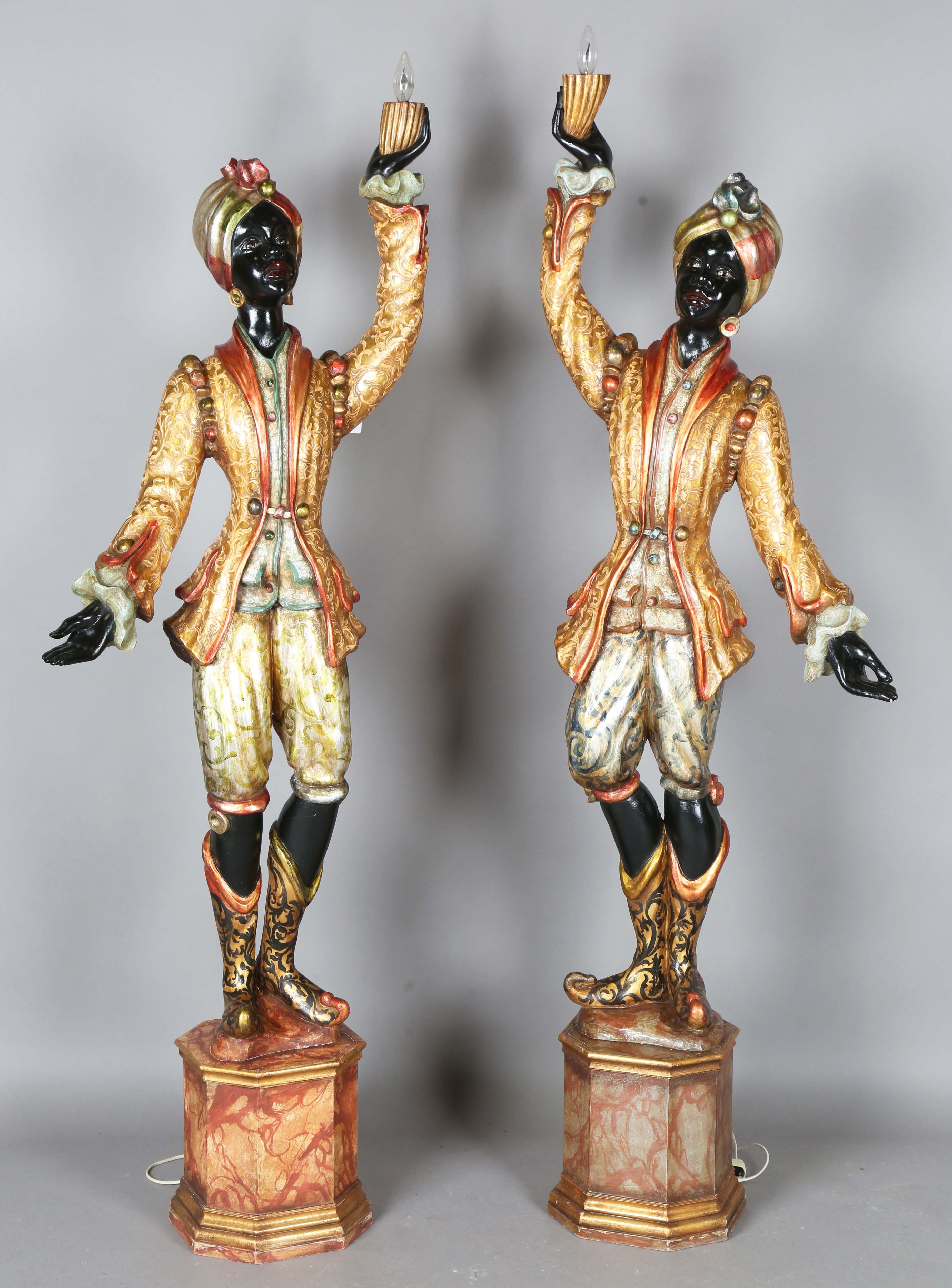 A pair of 20th century Continental blackamoor figural floor lamps, each standing figure supporting a single light and raised on a canted rectangular base, height 178cm.
