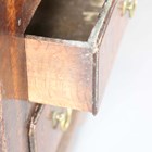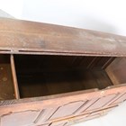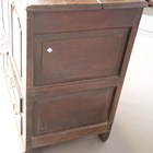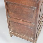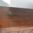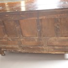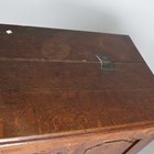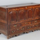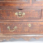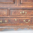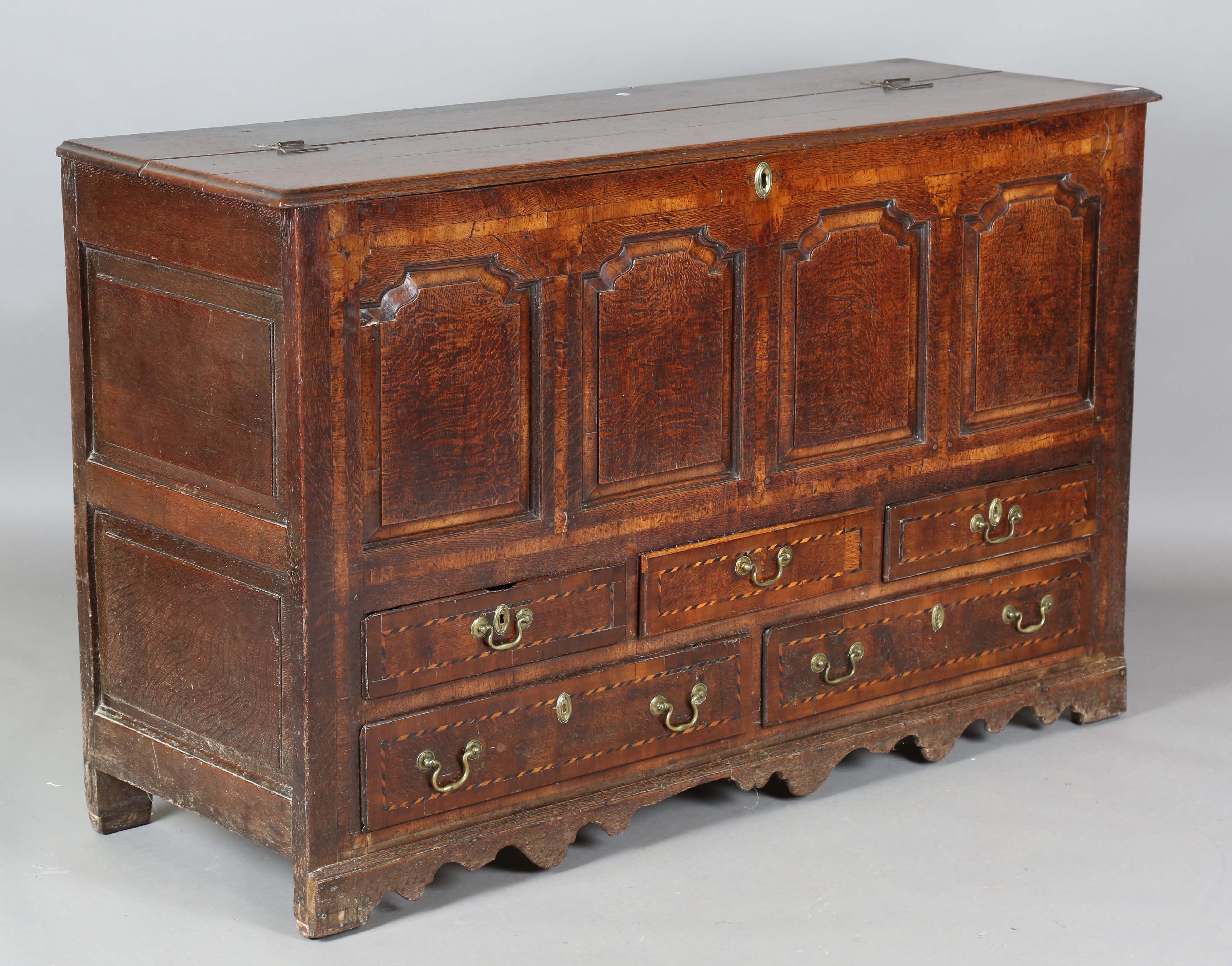 A George III provincial oak mule chest, the hinged top above four arched panels and an arrangement of five chequer banded drawers, height 92cm, width 150cm, depth 52cm.