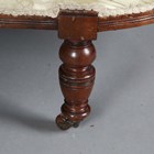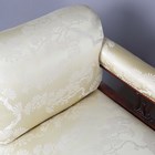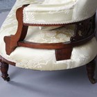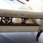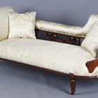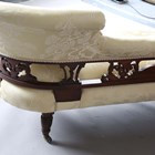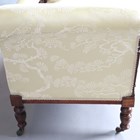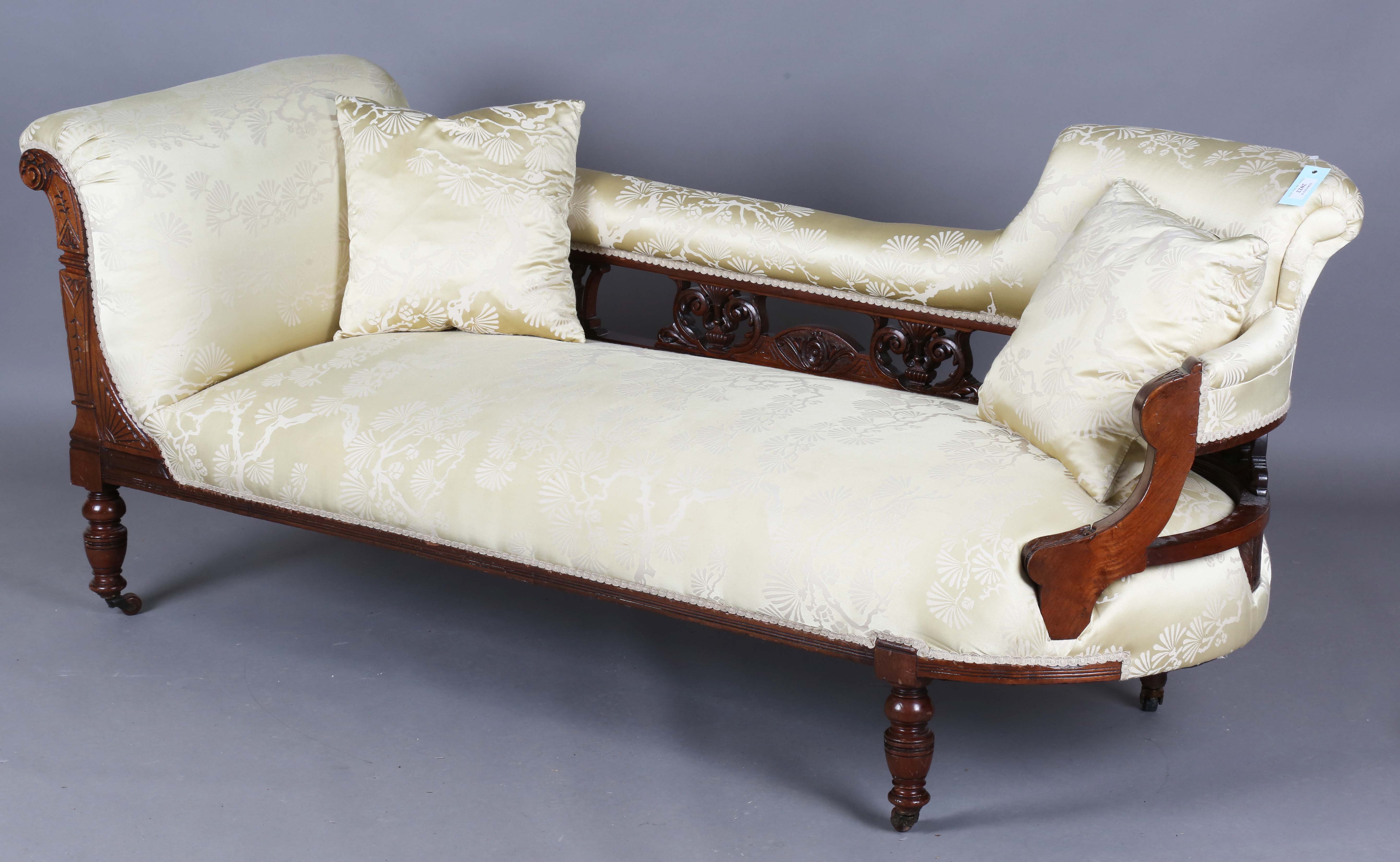 A late Victorian walnut framed chaise-longue, upholstered in pale yellow foliate damask, height 77cm, width 183cm, depth 65cm.