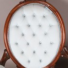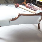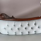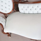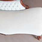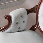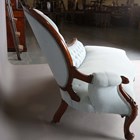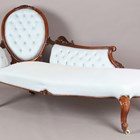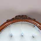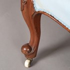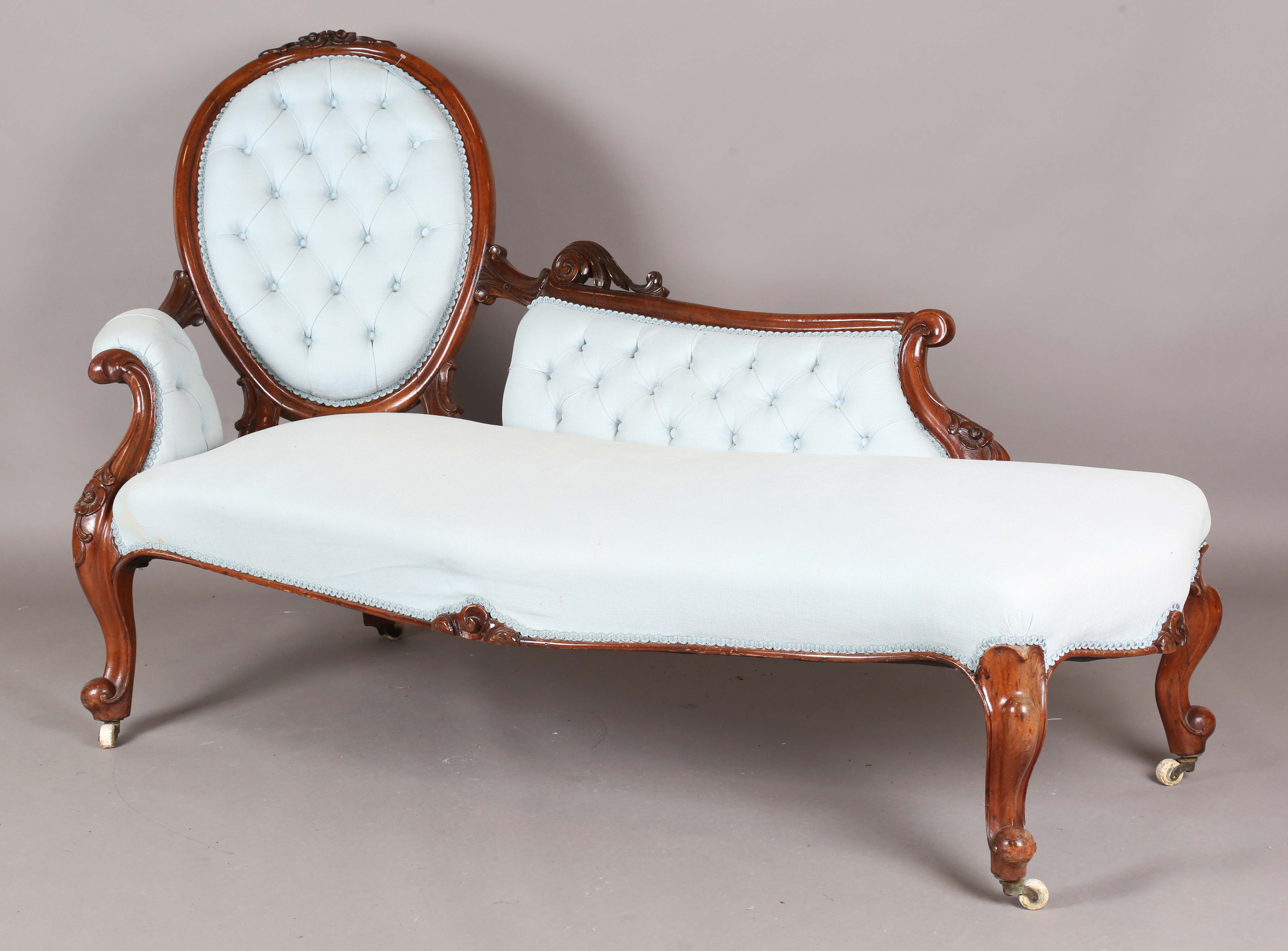 A mid-Victorian walnut showframe chaise longue, upholstered in pale blue fabric, raised on carved cabriole legs, height 100cm, length 180cm, depth 90cm.