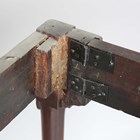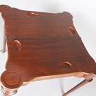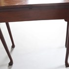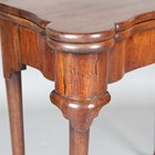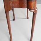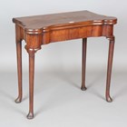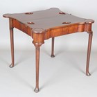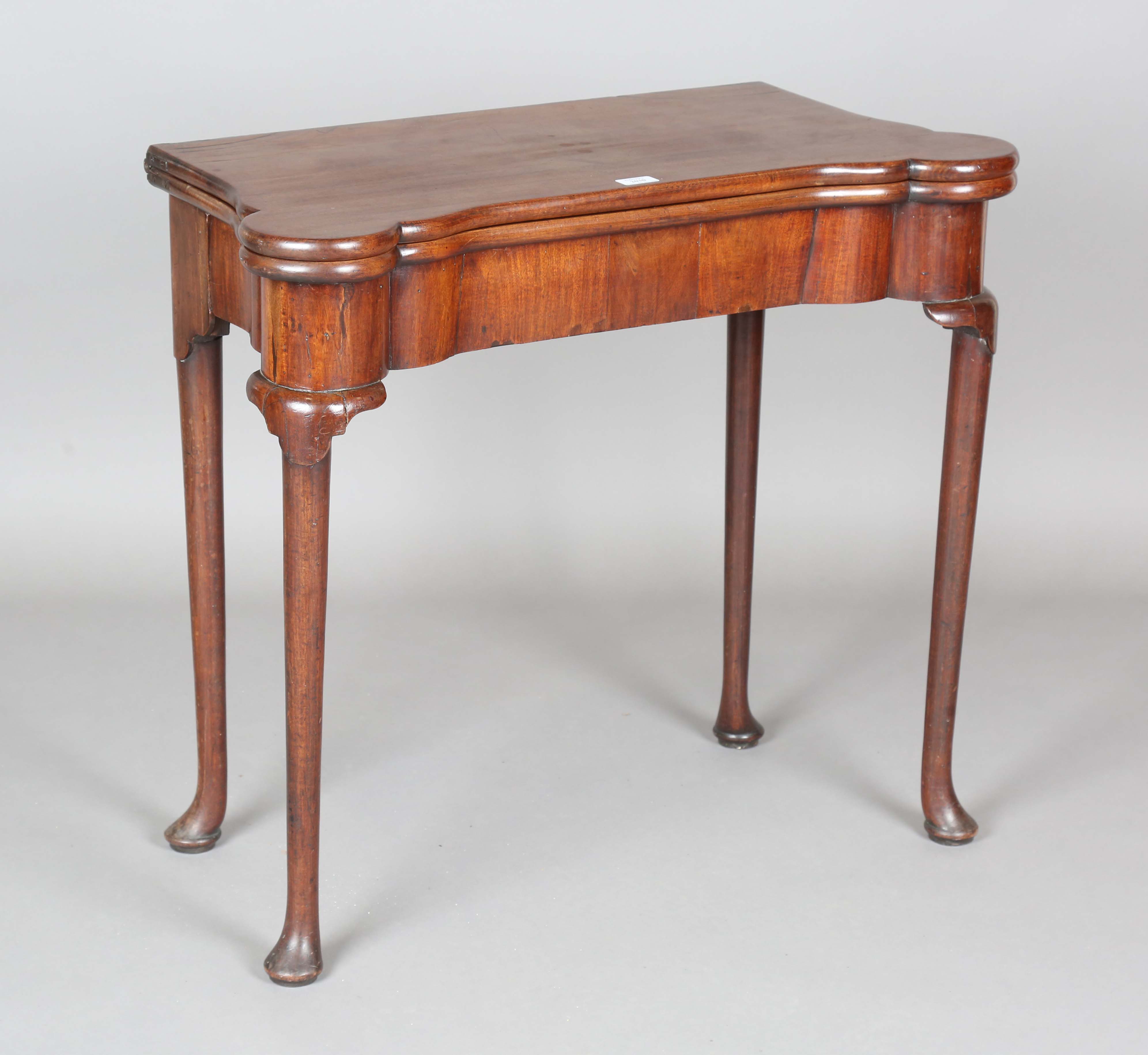 A George I red walnut fold-over concertina-action card table, the top with projecting corners and dished recesses, the turned tapering legs with lappet shoulders and pad feet, height 73cm, width 83cm, depth 40.5cm (some alterations).