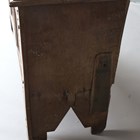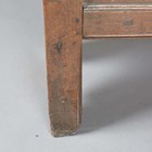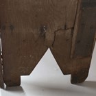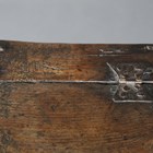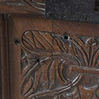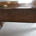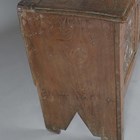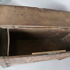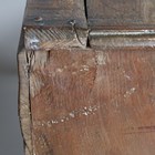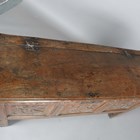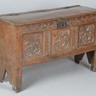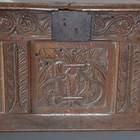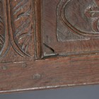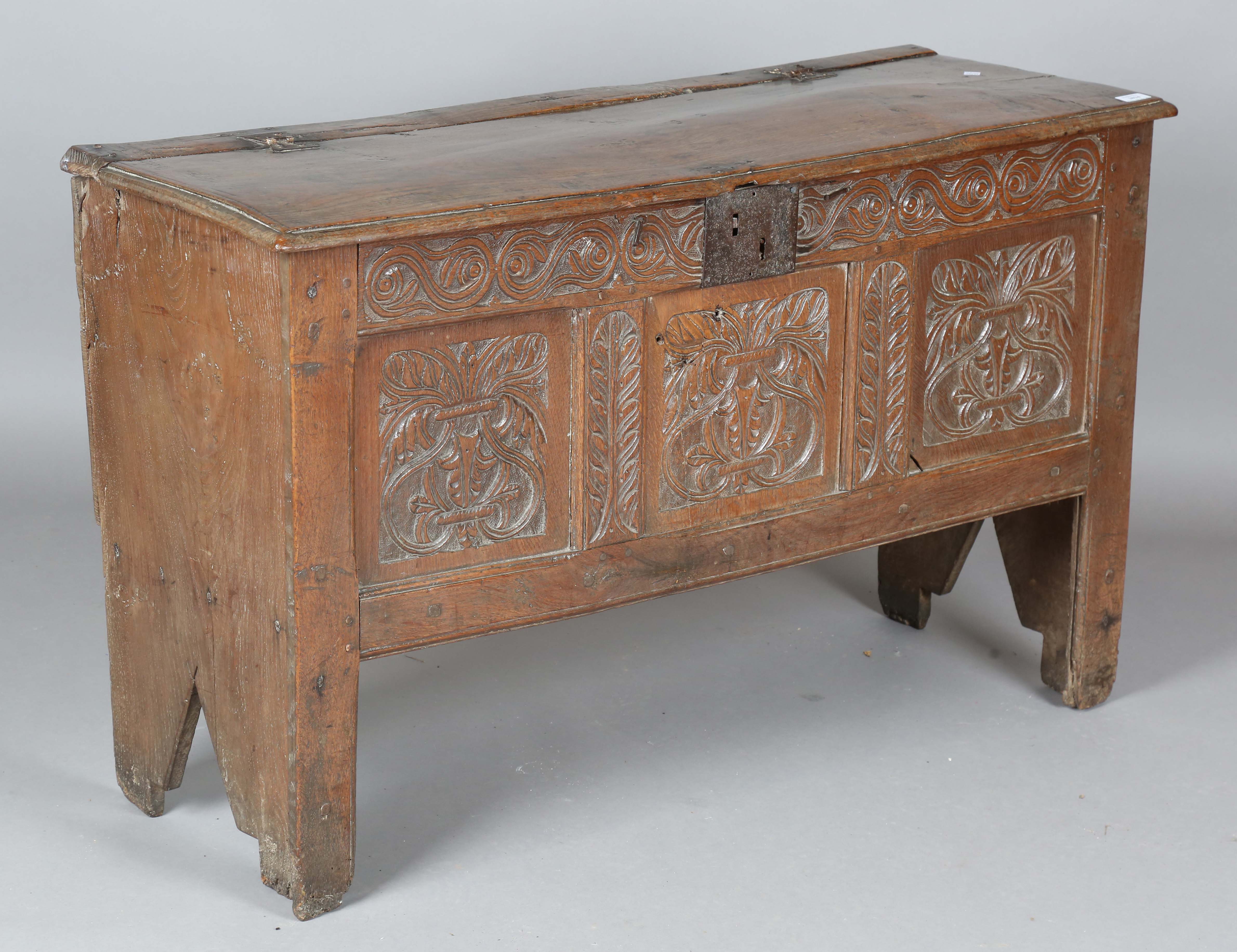A 17th century oak coffer, the hinged lid above a carved panel front, height 72cm, width 121cm, depth 42cm (alterations).