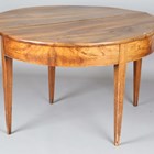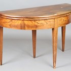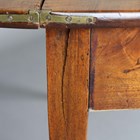 A 19th century French provincial walnut demi-lune fold-over tea table, height 75cm, width 121cm, depth 59cm (faults).