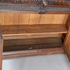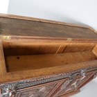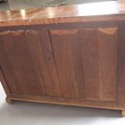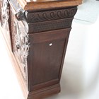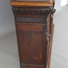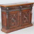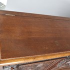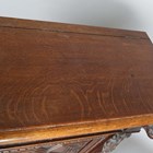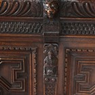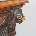 A late 19th century carved oak side cupboard, the hinged top above two doors with overall geometric mouldings and carved with lions' masks, height 101cm, width 142cm, depth 39cm.