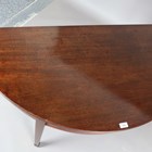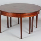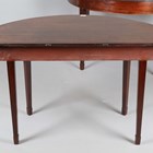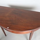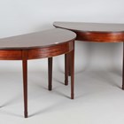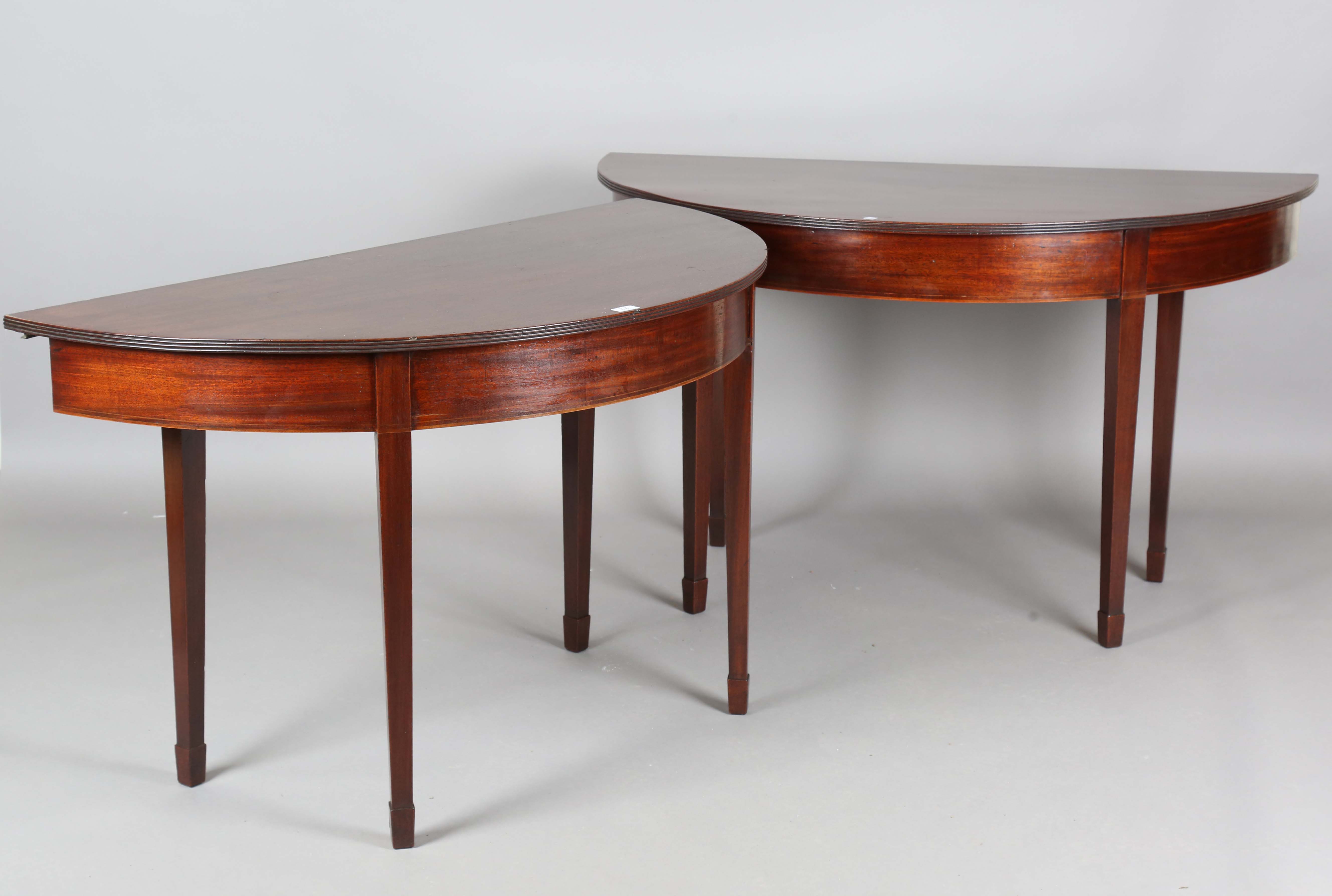 A pair of George III mahogany demi-lune tables with line inlaid frieze panels and square tapering legs, height 73cm, width 126cm, depth 63cm.