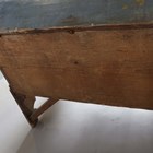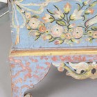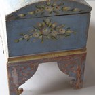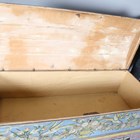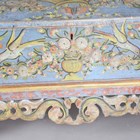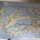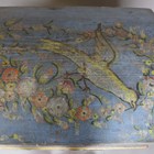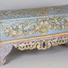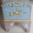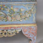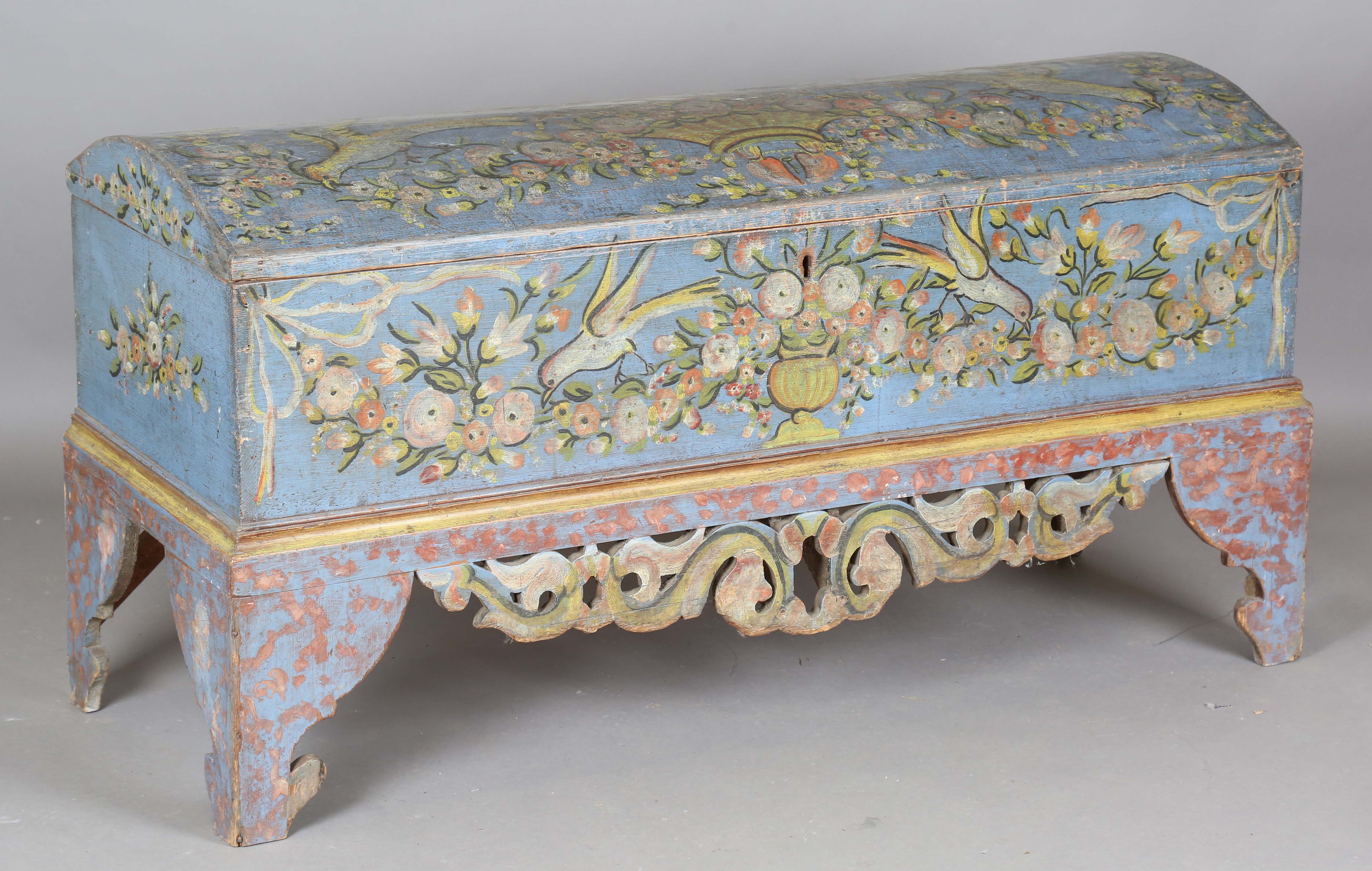 A late 19th century Italian painted pine cassone, decorated with overall flower-filled urns and birds on a pale blue ground, the domed lid above a shaped frieze and tall bracket feet, height 80cm, width 157cm, depth 61cm.