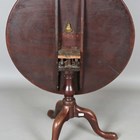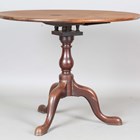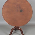 A George III mahogany circular tip-top supper table, the turned baluster stem with a birdcage mount and tripod legs, height 73cm, diameter 92cm (stripped top).