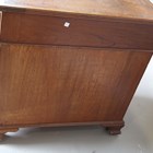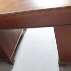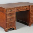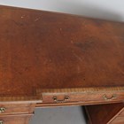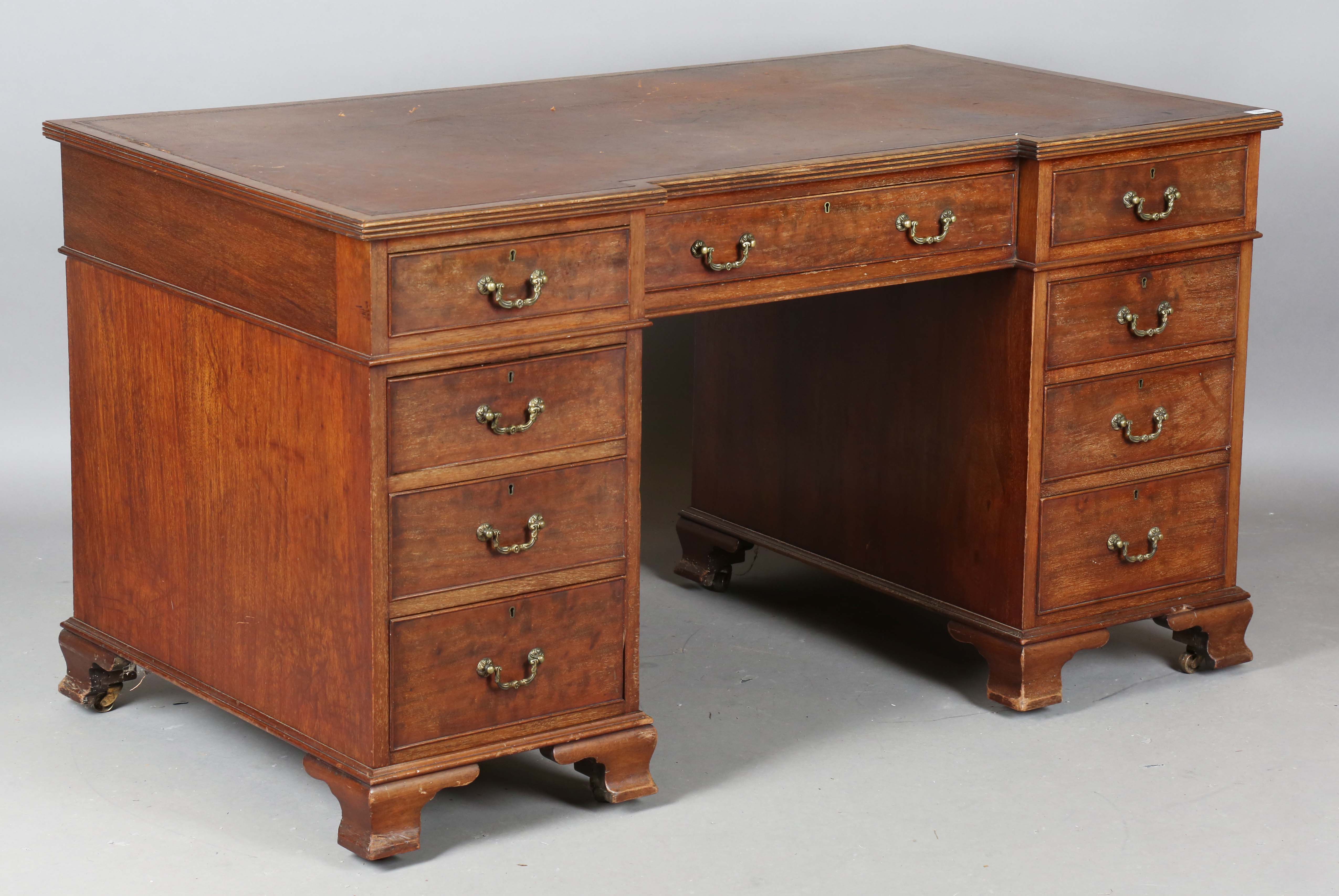 An early 20th century mahogany twin-pedestal desk, the inverted breakfront top inset with brown leather top above nine drawers, height 76cm, width 137cm, depth 76cm.