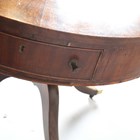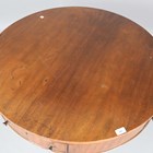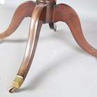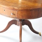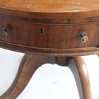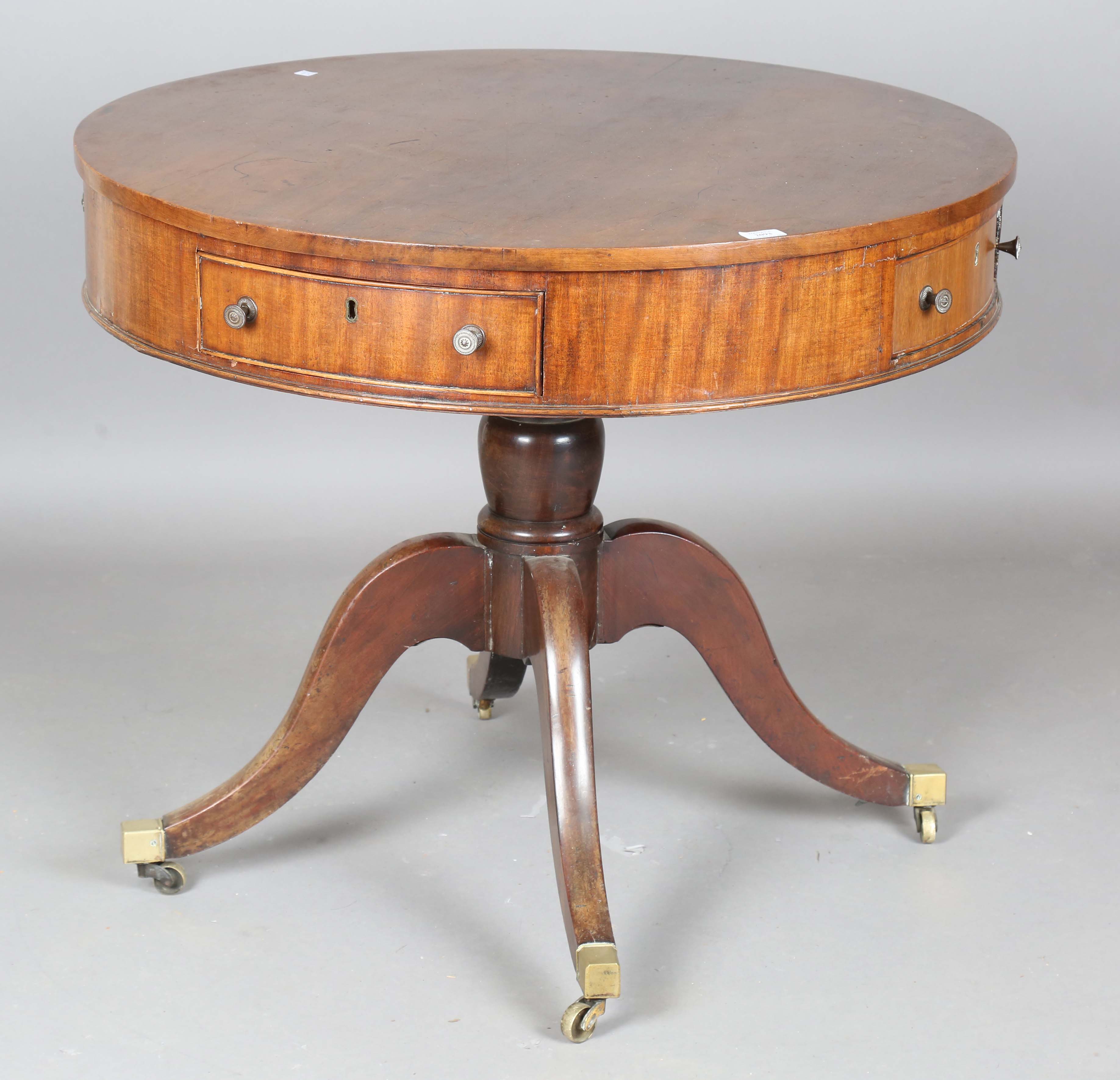 A 19th century and later mahogany drum table, the frieze fitted with four drawers, raised on a turned column and downswept legs with brass castors, height 74cm, diameter 89cm (faults and alterations).