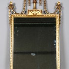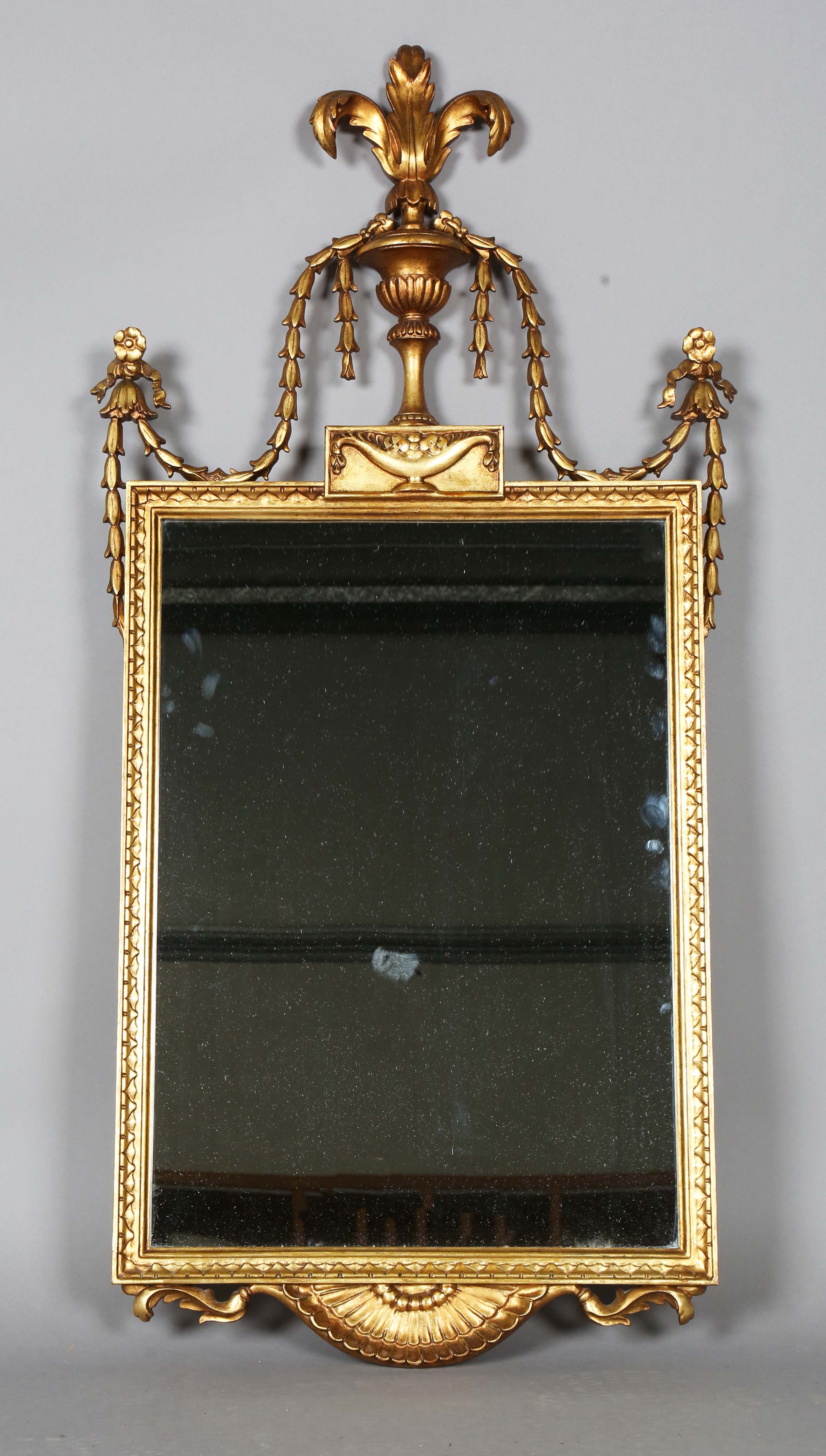 A late 20th century Neoclassical wall mirror with urn and swag surmount, height 126cm, width 62cm.