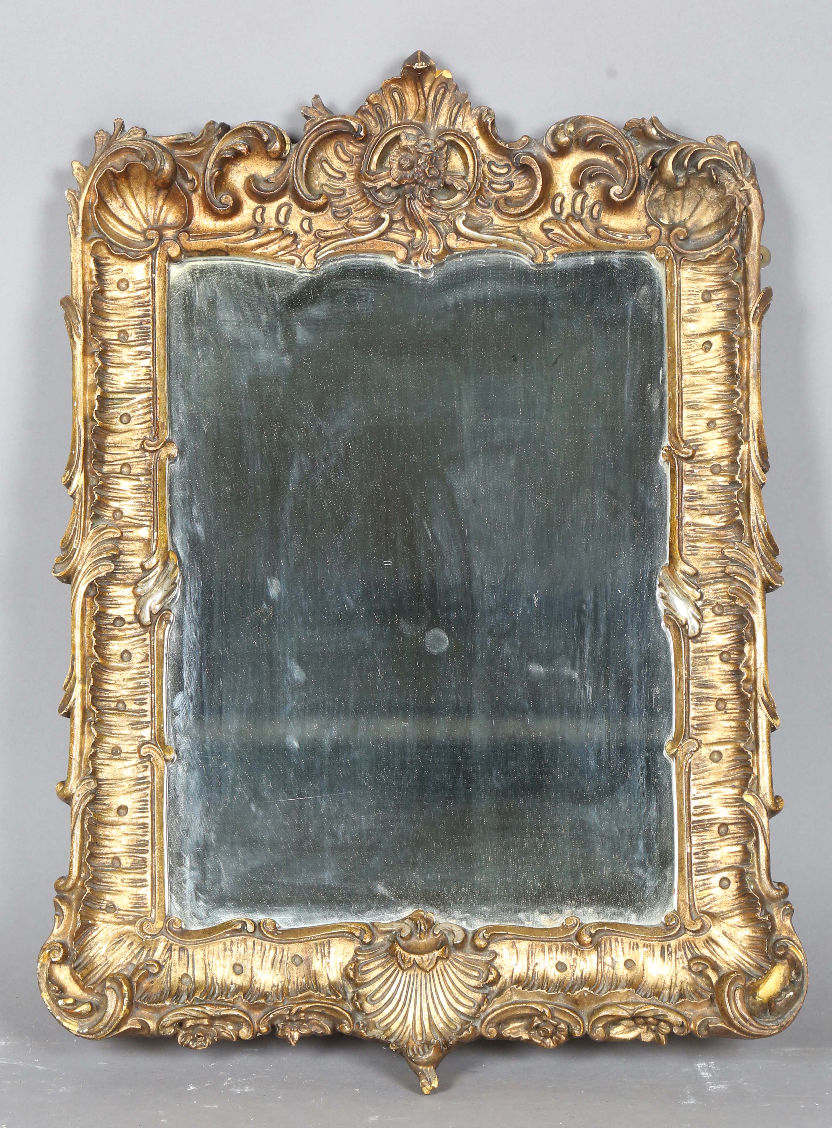 An early 20th century Continental Rococo Revival gilt gesso wall mirror of shaped rectangular form, 60cm x 42cm.