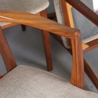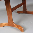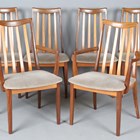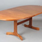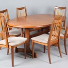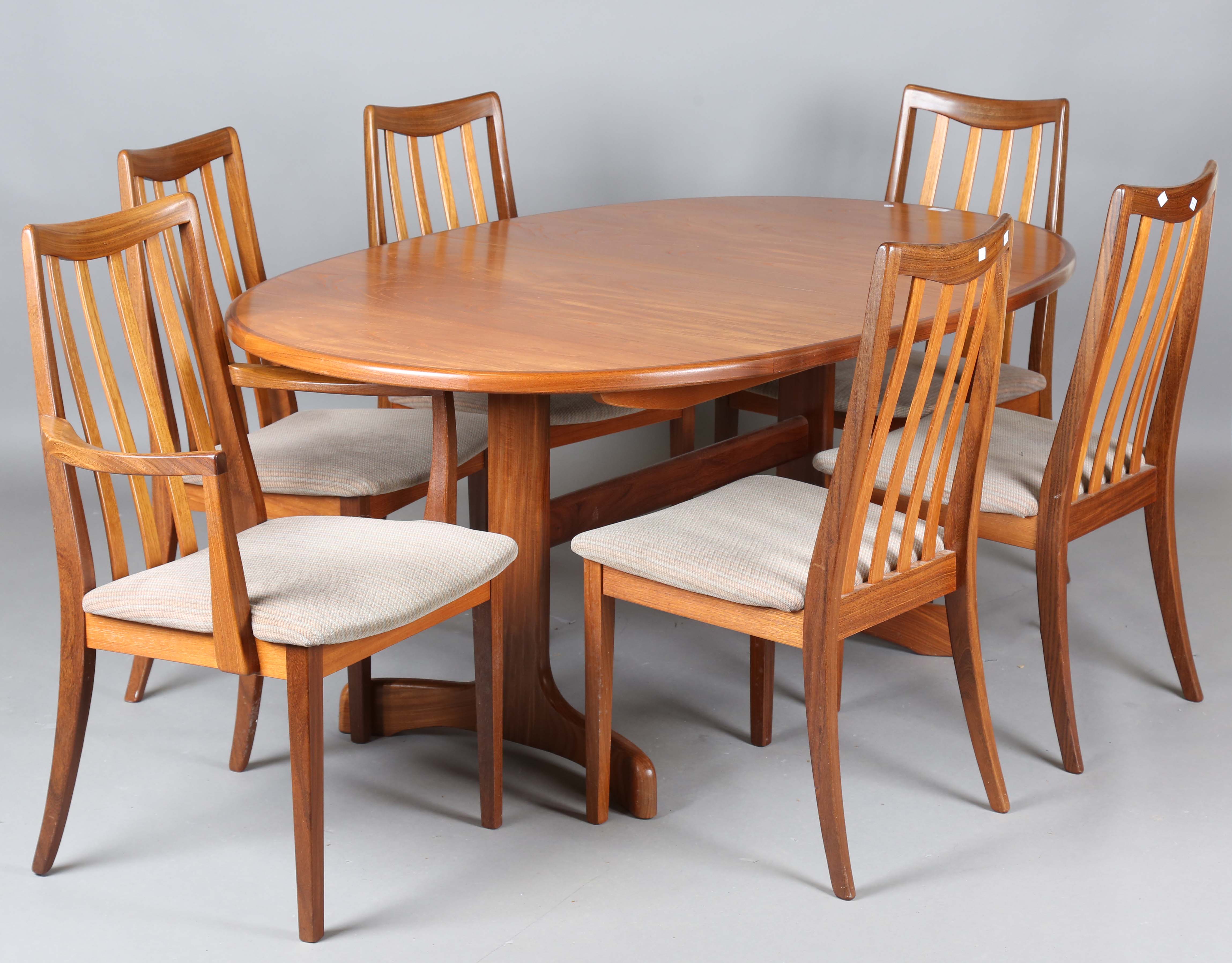 A mid/late 20th century G-Plan teak extending dining table, the oval top with single extra leaf, height 72cm, unextended length 163cm, extended length 209cm, depth 107cm, together with a set of six matching dining chairs.