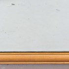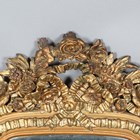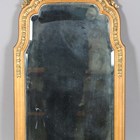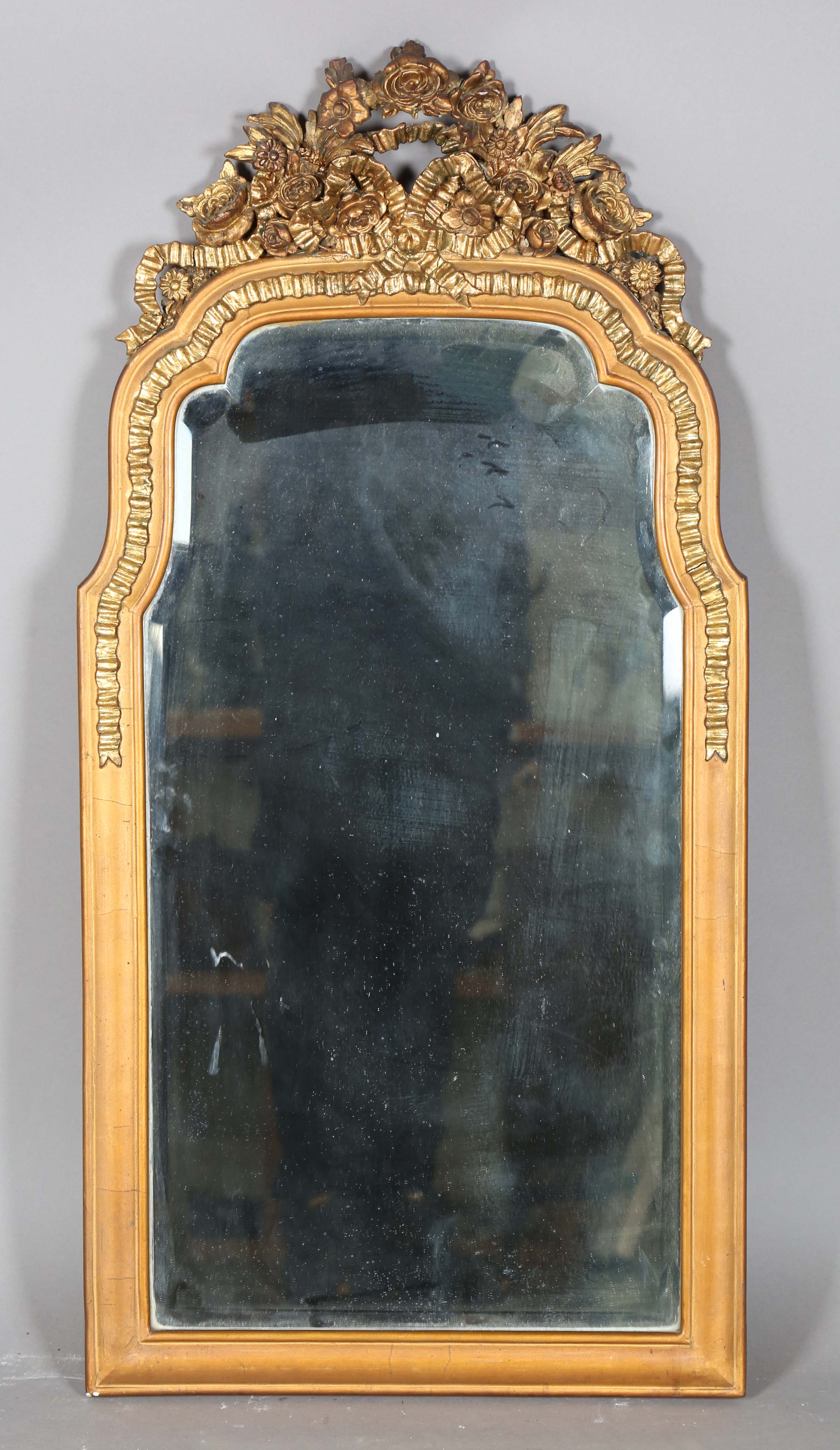 An early 20th century Continental gilt composition arched wall mirror, the flower and ribbon surmount above a bevelled glass, 100cm x 49cm (some faults and repairs).